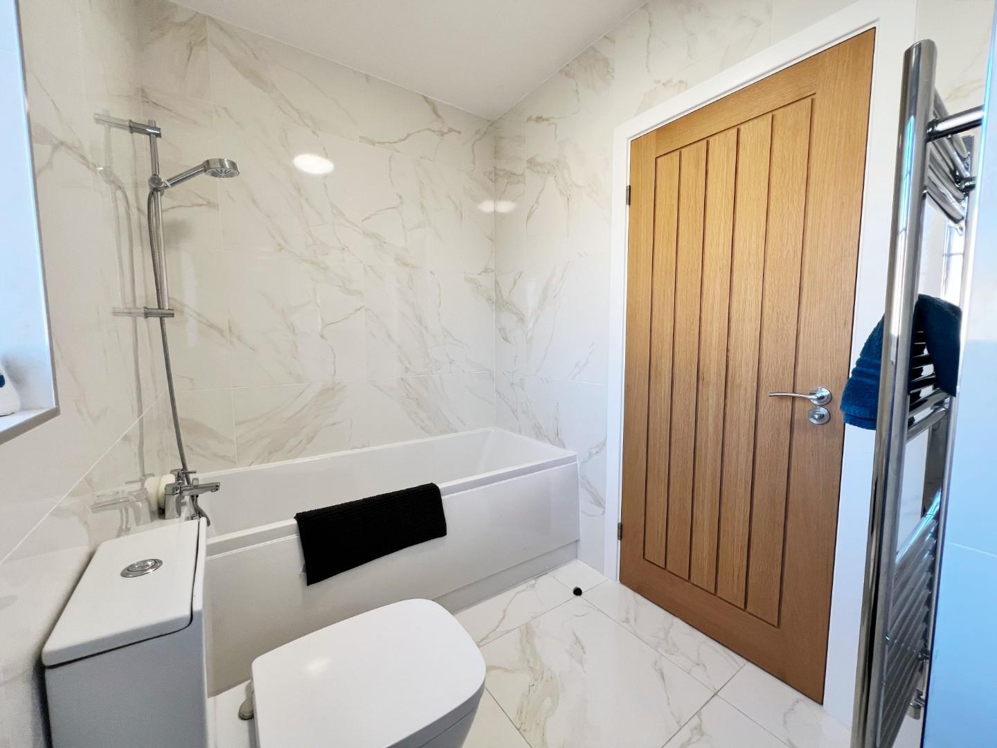 White panelled bath with shower over, wash hand basin, W/C, uPVC window, fully tiled, chrome towel radiator, extractor fan.