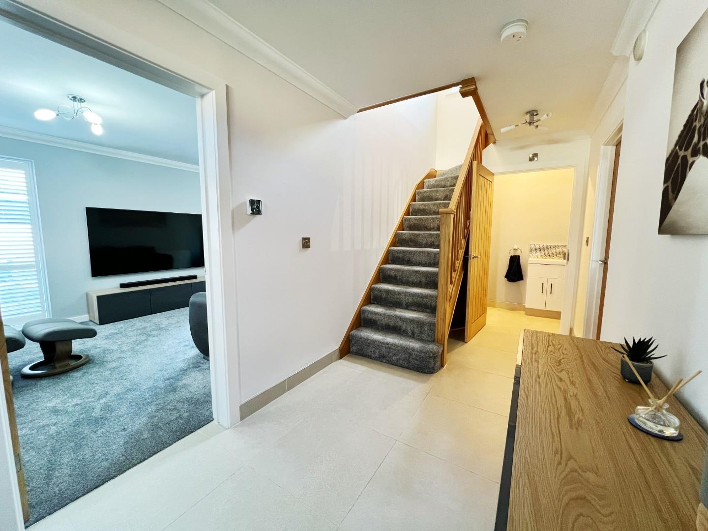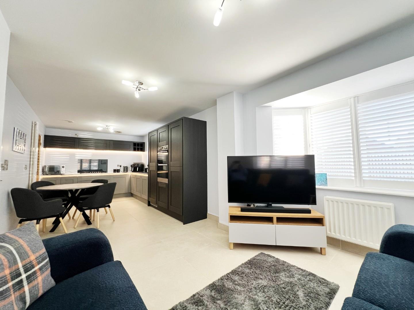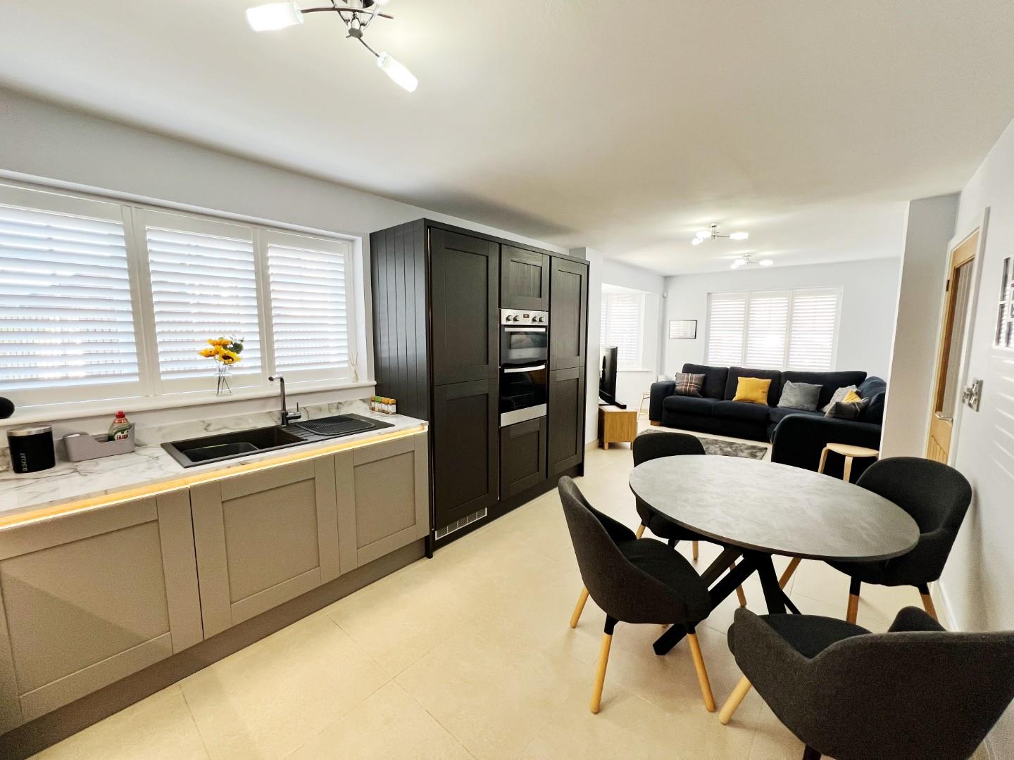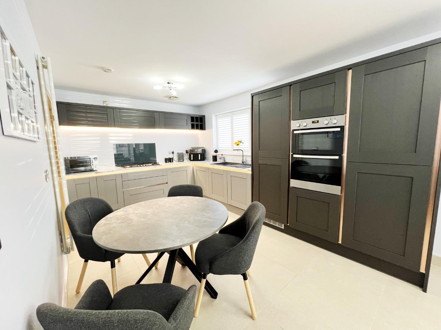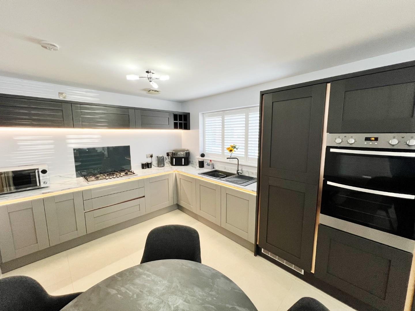 Stunning wall and base units, integrated double oven, five ring hob, fridge freezer, dishwasher, quartz sink with mixer tap and drainer, stylish worktops with matching splashbacks, under counter lighting, space for dining room table, uPVC windows with shutter blinds, feature radiator, tiled flooring, extractor fan.
