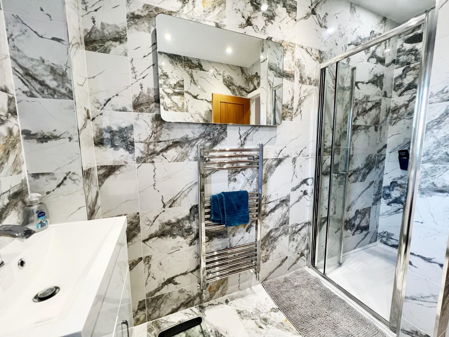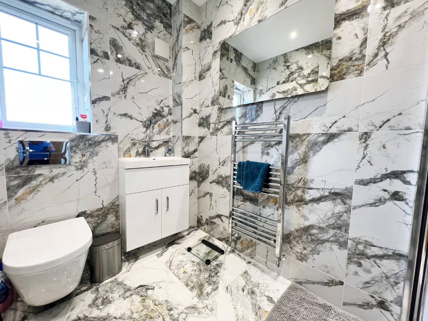 Double shower cubicle, wash hand basin, W/C, chrome towel radiator, fully tiled, uPVC window, extractor fan.