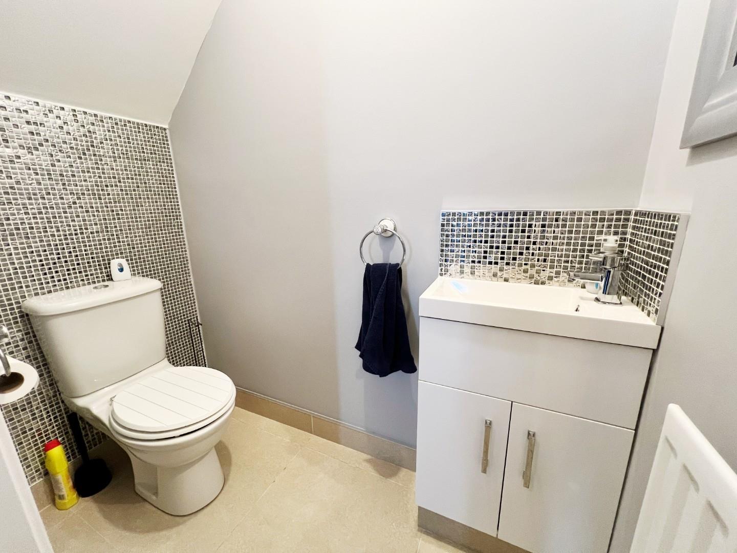 W/C, wash hand basin, extractor fan, radiator, tiled flooring.