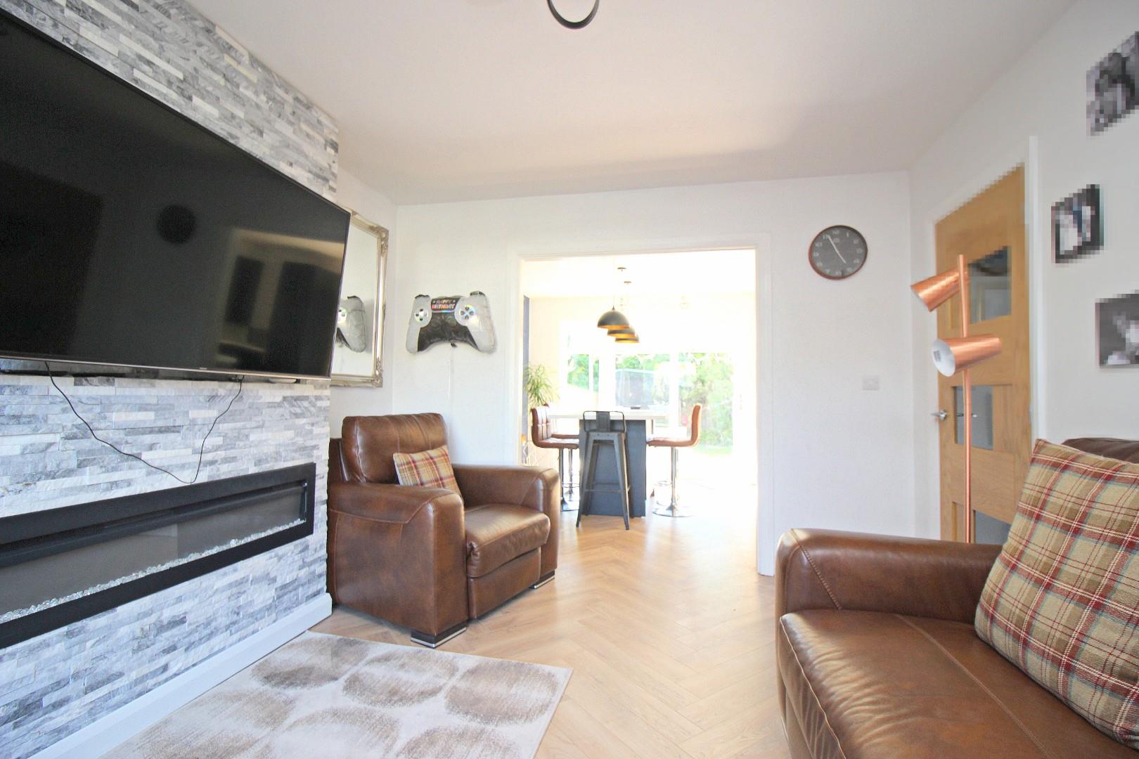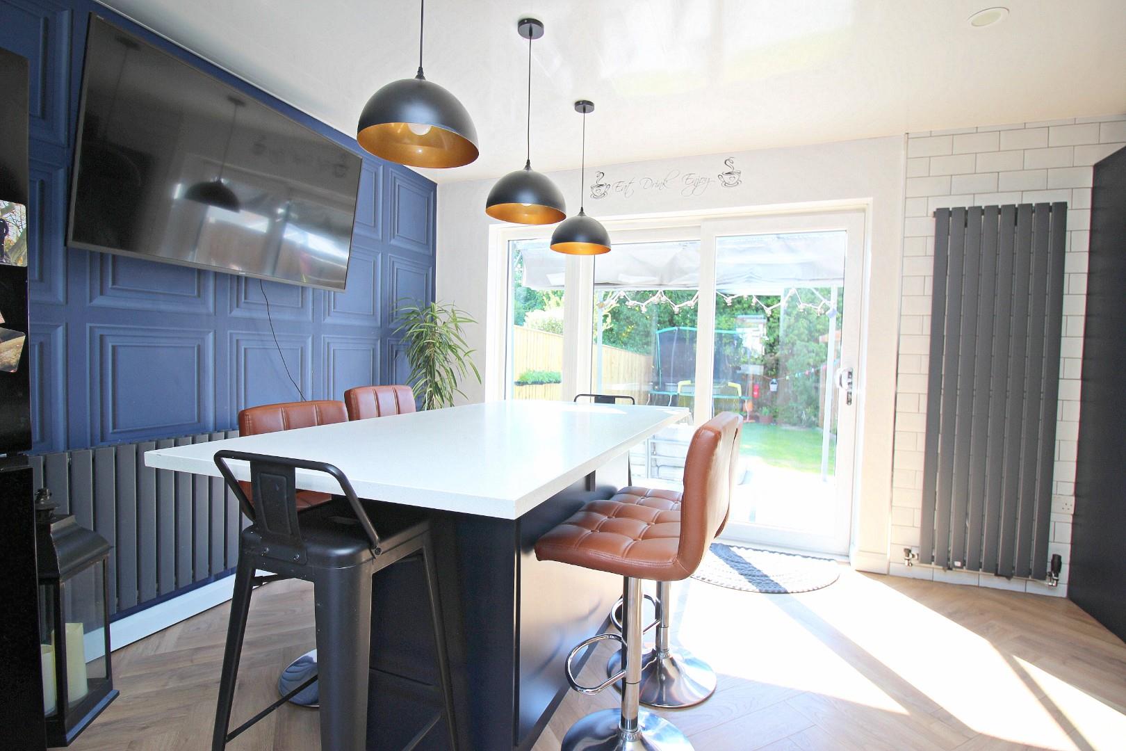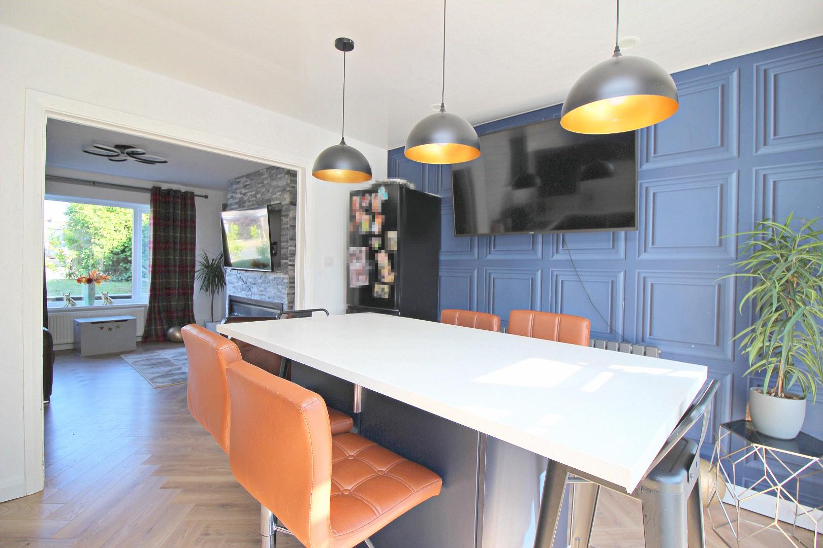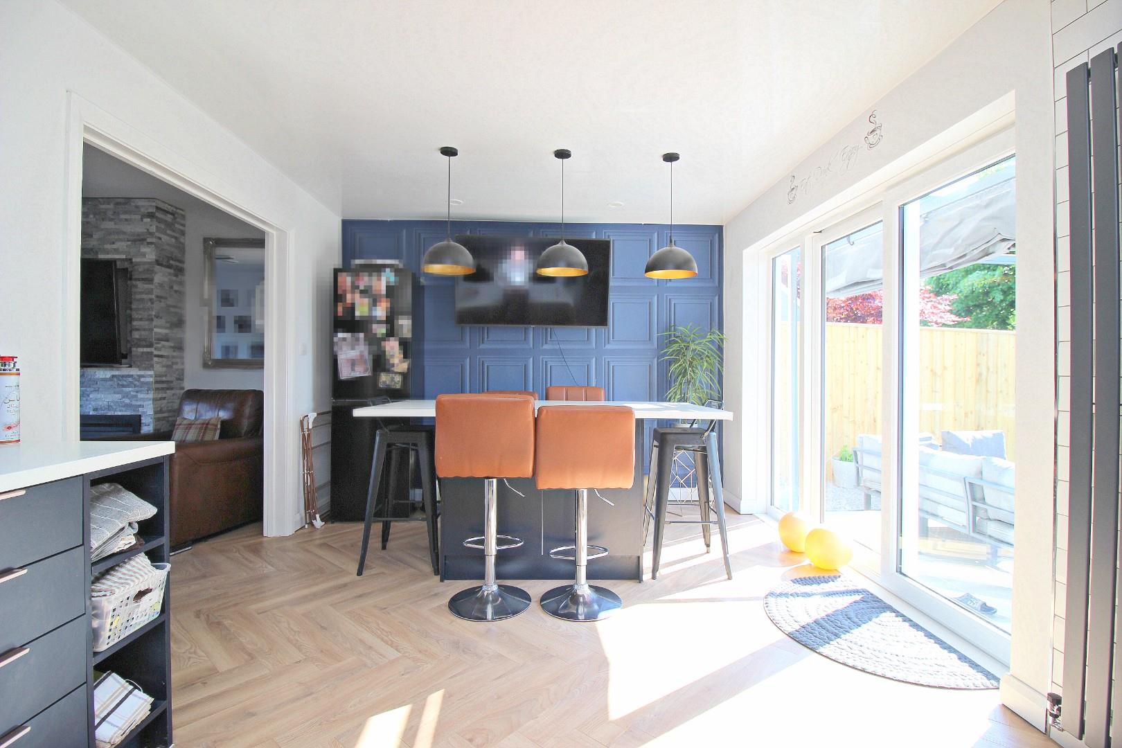 The ground floor begins with a welcoming hallway that gives access to the useful utility room and impressive 'L' shaped garage, offering excellent storage or potential for a workshop or home gym. There is a comfortable lounge to the front, while the heart of the home lies to the rear – a stunning re-fitted kitchen with built-in seating and large sliding doors opening out onto the rear garden.