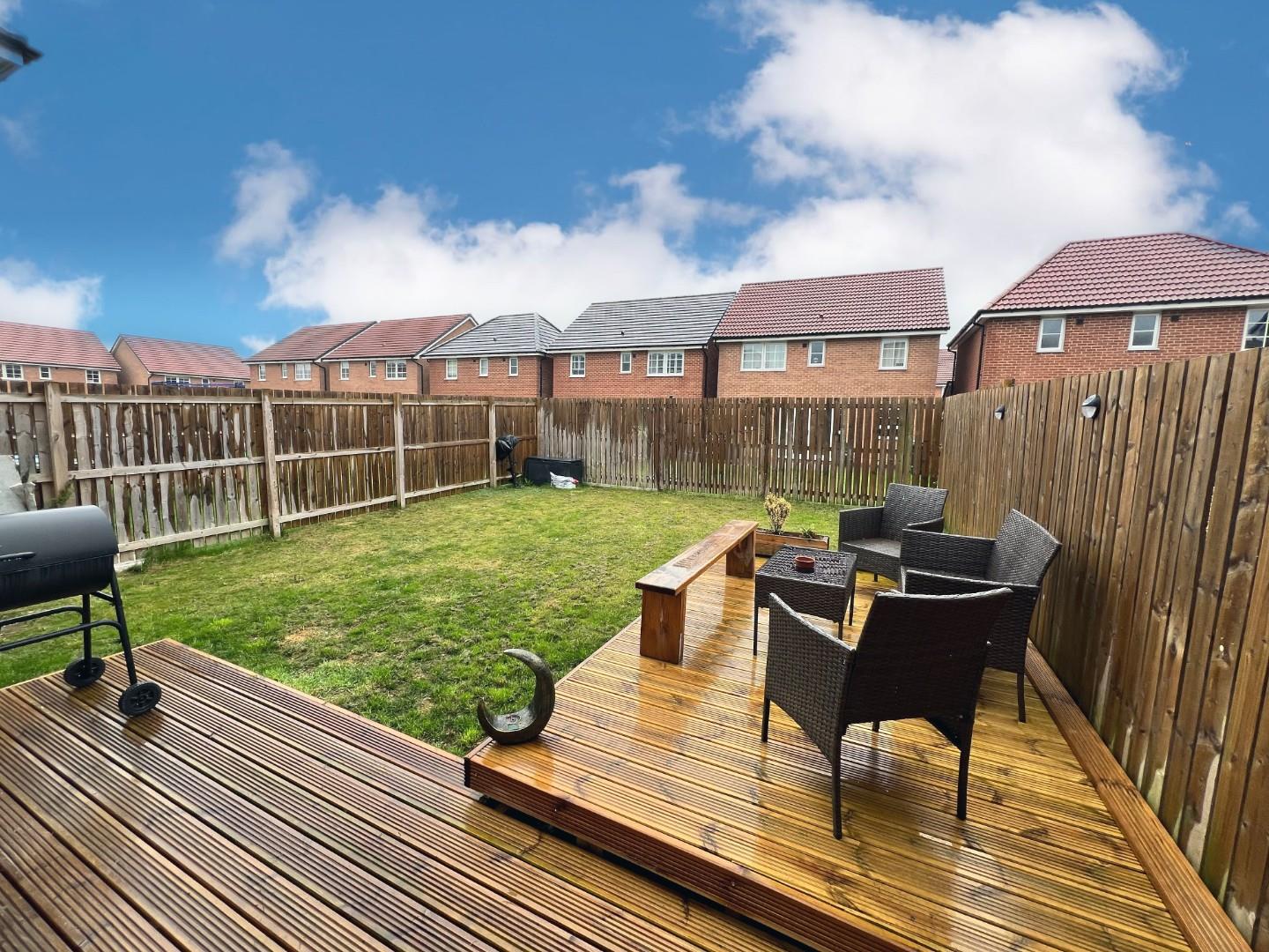 To the front elevation, there is a easy to maintain garden and block paved driveway. While to the rear, there is a larger tan average enclosed garden and decked area.