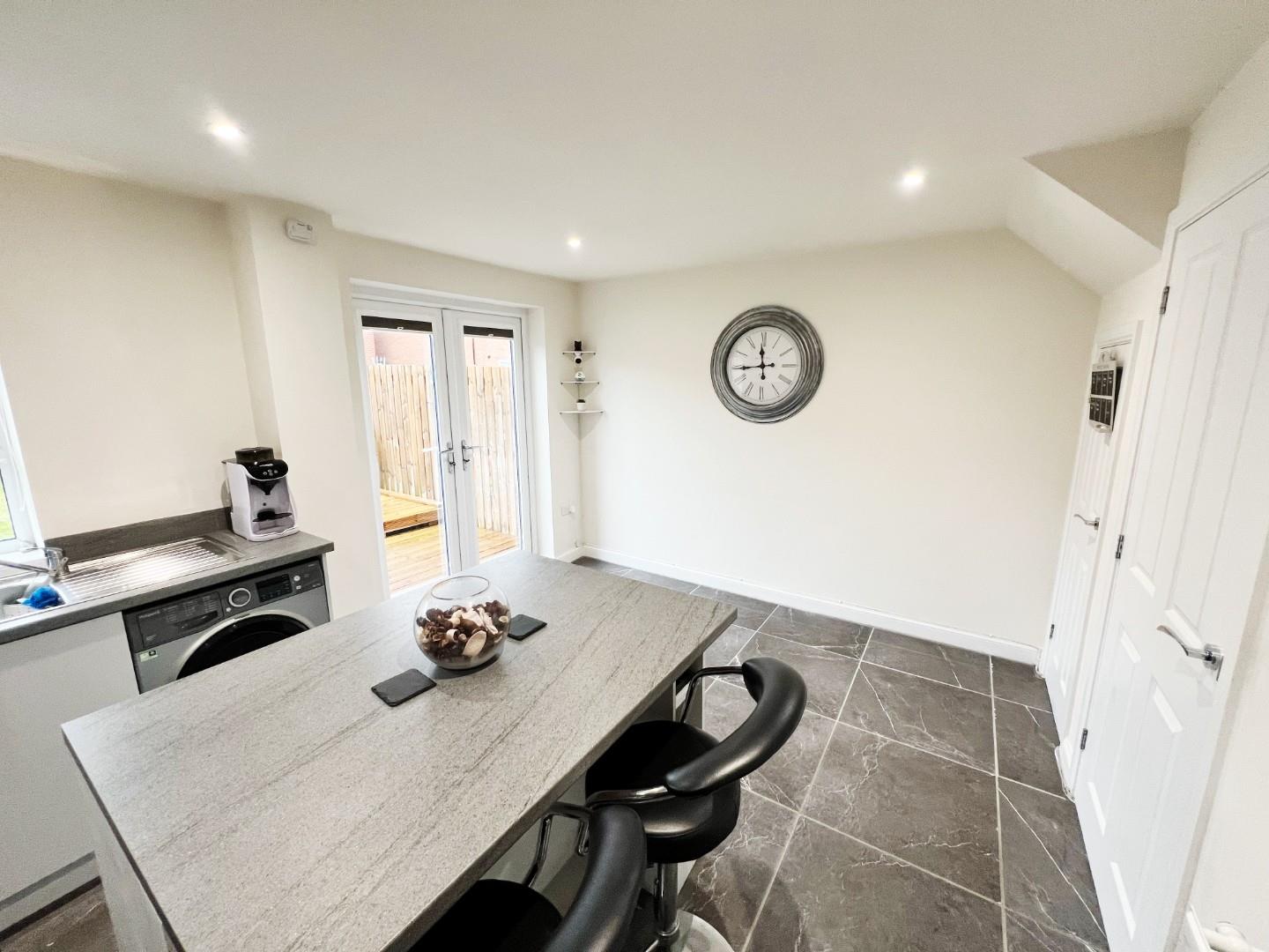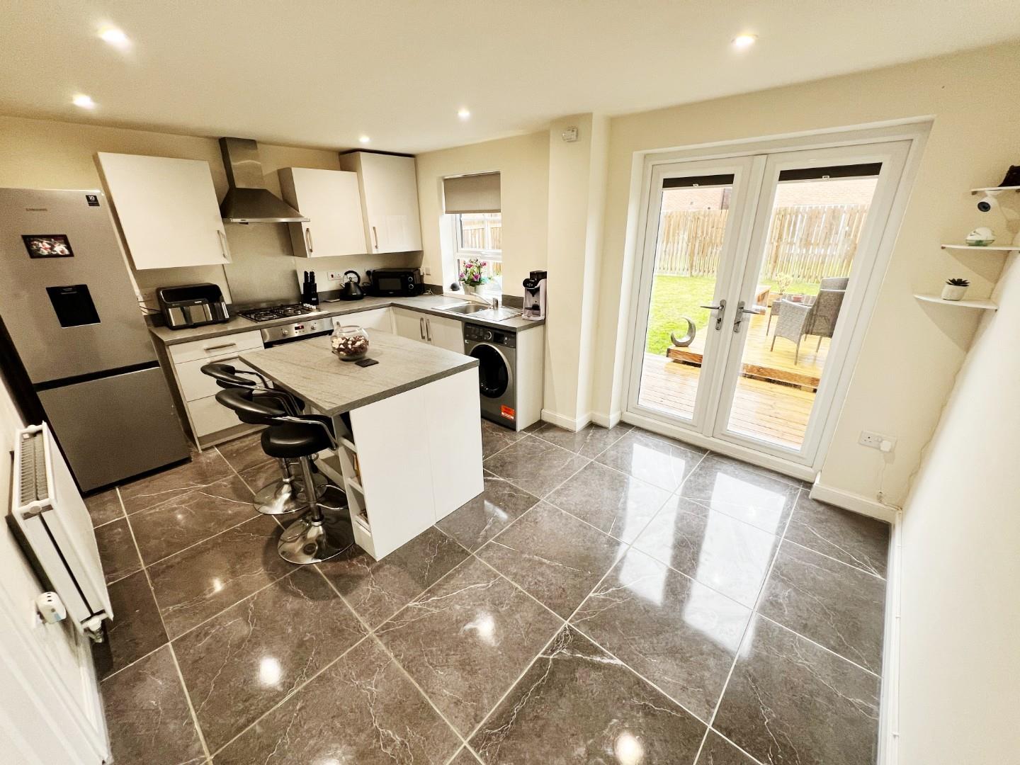 Modern white wall and base units, integrated oven, hob, extractor fan, plumbed for washing machine, stainless steel sink with mixer tap and drainer, space for fridge freezer, central island, tiled flooring, uPVC window, radiator, French doors leading to the rear, storage cupboard.