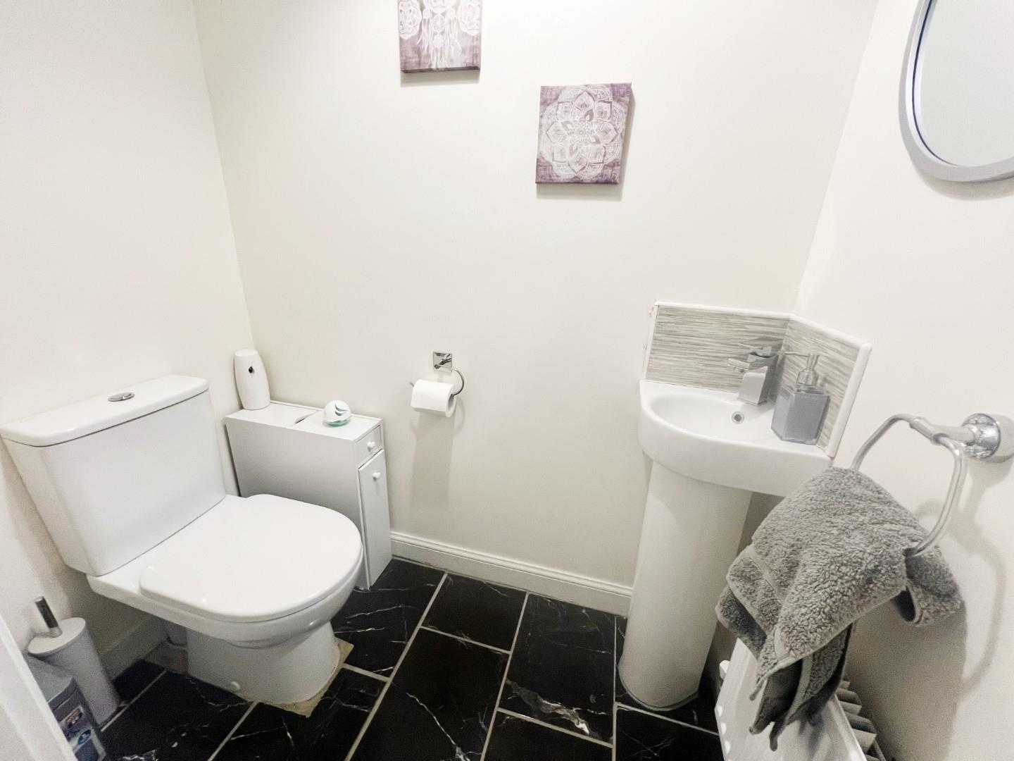W/C, wash hand basin, radiator, extractor fan, tiled flooring.