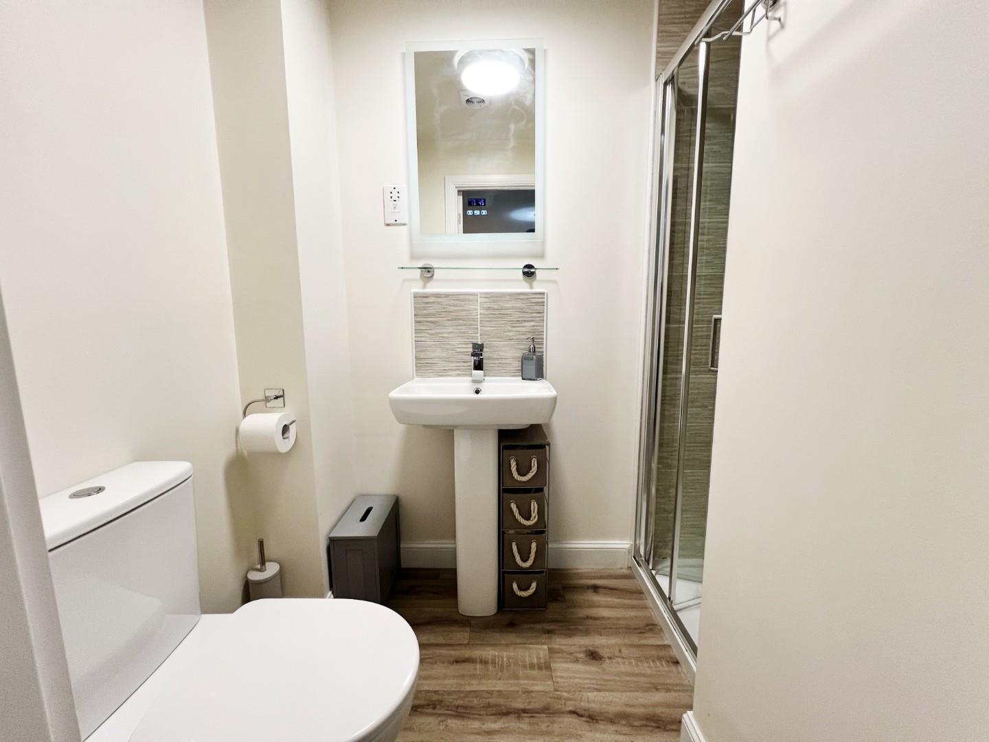 Shower cubicle, wash hand basin, w/c, extractor fan, radiator.