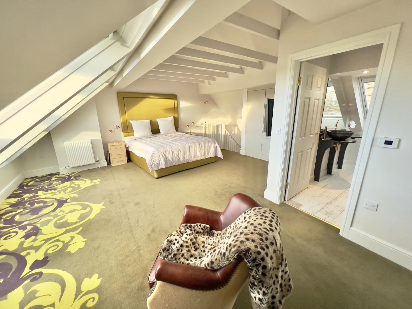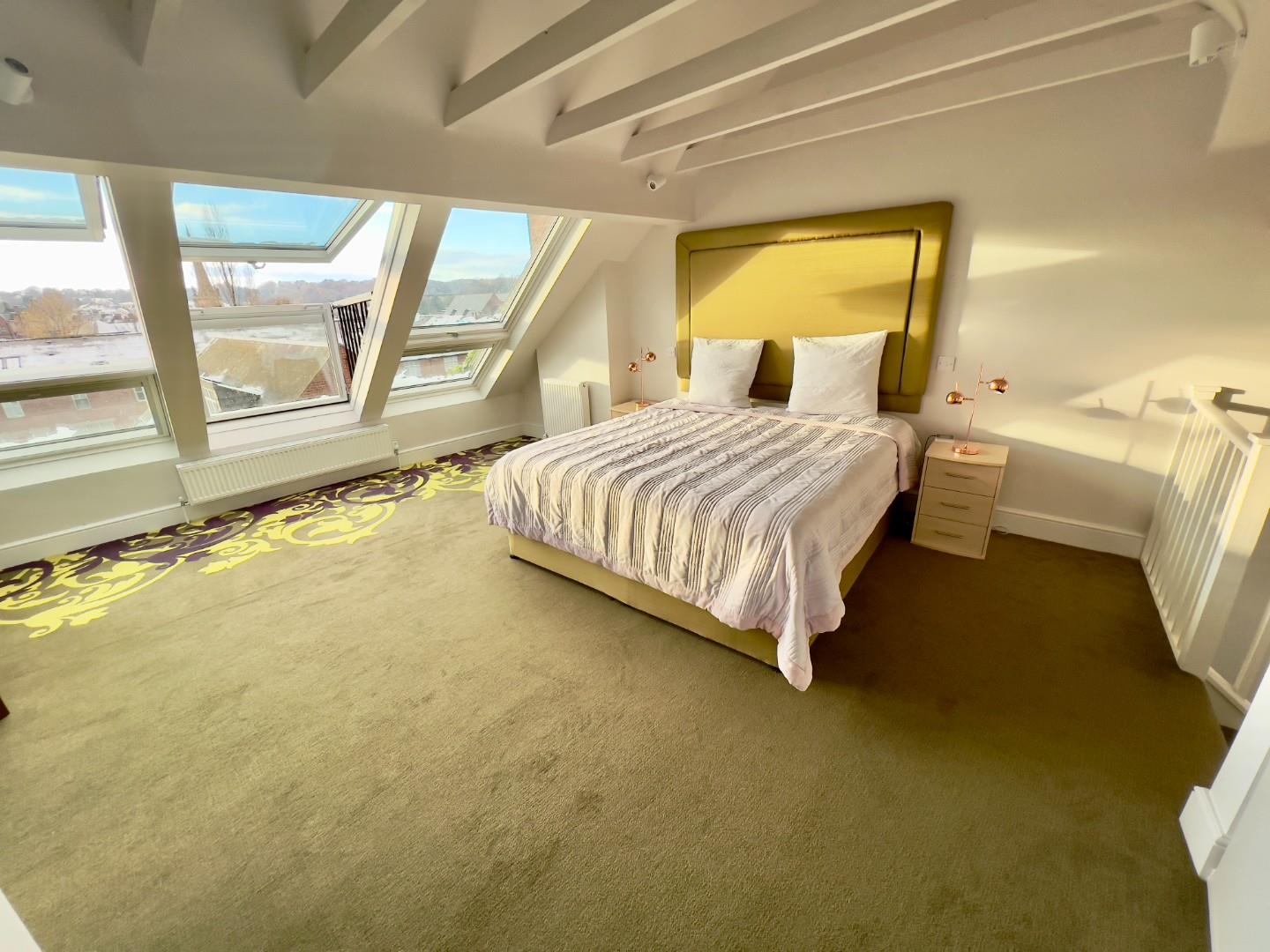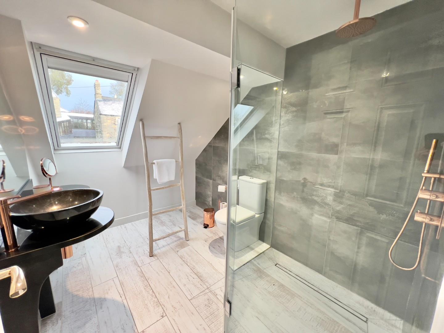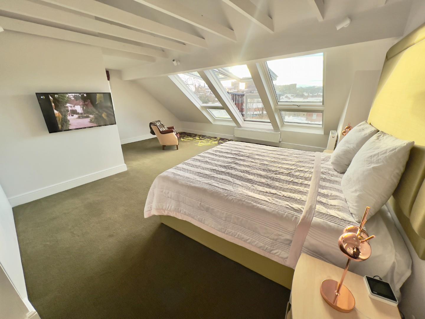 The top floor presents the most impressive space in the home—a striking second lounge or bedroom that showcases breath-taking views of Durham Castle and Cathedral, among the finest in the city. Adjoining this room is a standout bathroom, featuring eye-catching charcoal grey tiles, underfloor heating, and premium rose gold fixtures. Soundproofing throughout adds to the home’s comfort and quiet luxury.