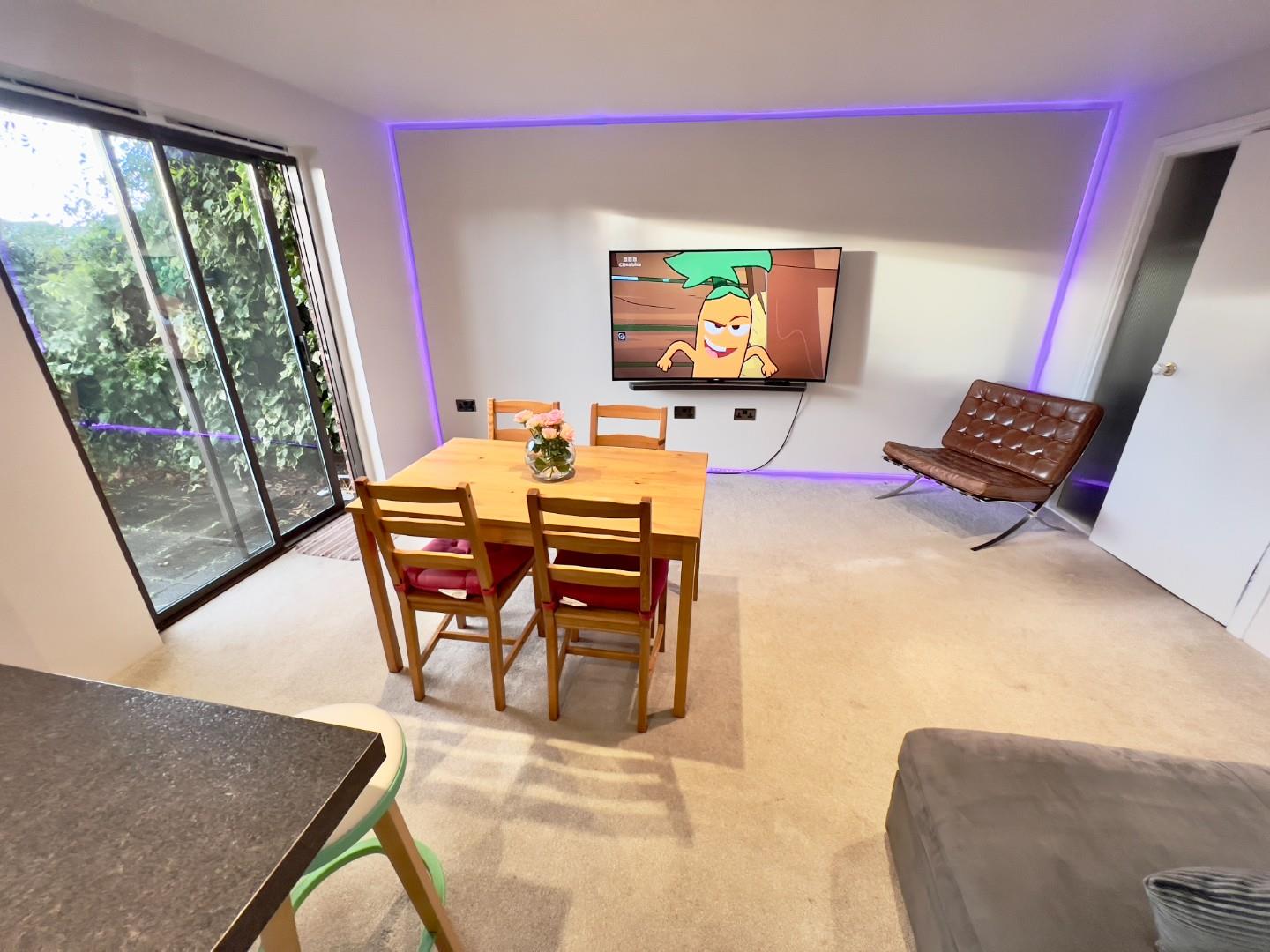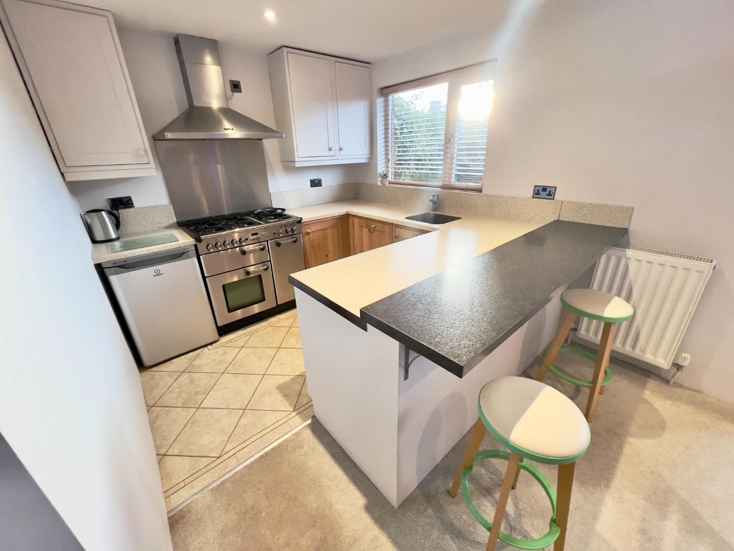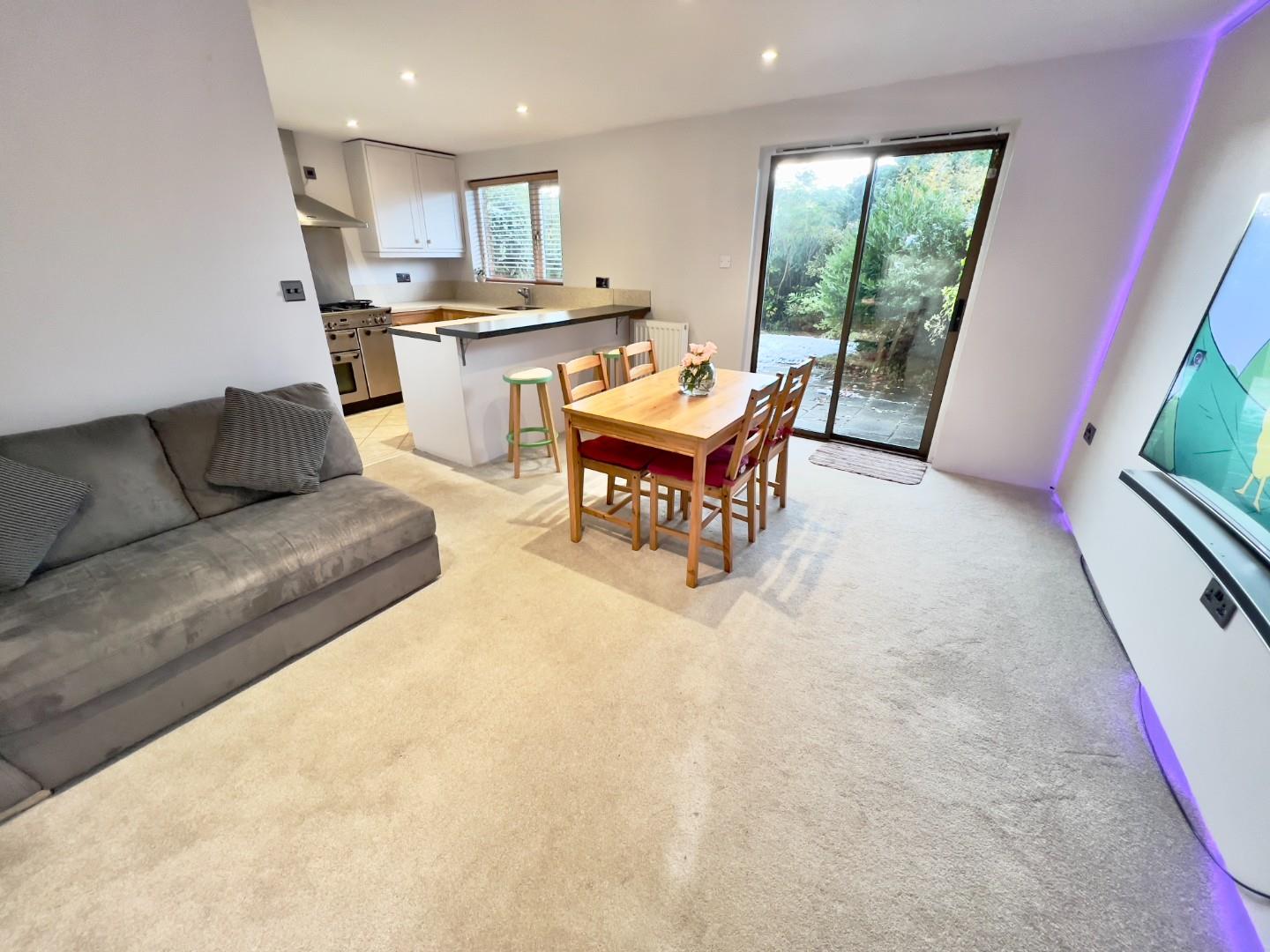 The ground floor has a bright, open-plan kitchen & living area, ideal for both entertaining and everyday living. Sliding patio doors lead to a private, well-kept rear garden with tall hedge providing natural seclusion. A beautifully designed shower room is also found on this level, complete with a walk-in shower, WC, basin, underfloor heating, and sleek marble-style finishes. Hidden cupboards discreetly house laundry facilities including space for a washing machine and tumble dryer. A versatile bedroom on this floor can comfortably fit a double or single bed or serve as a home office or nursery.