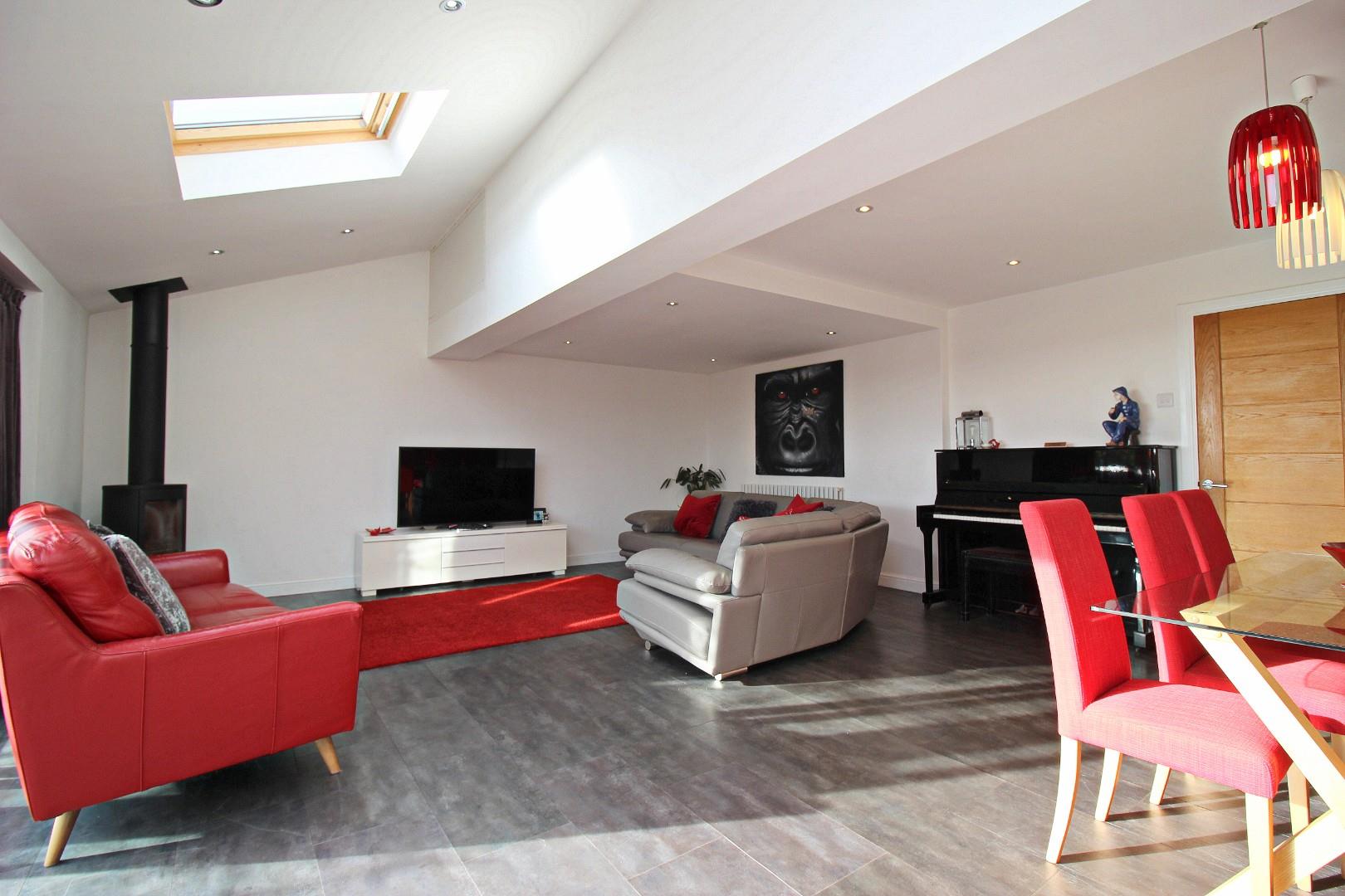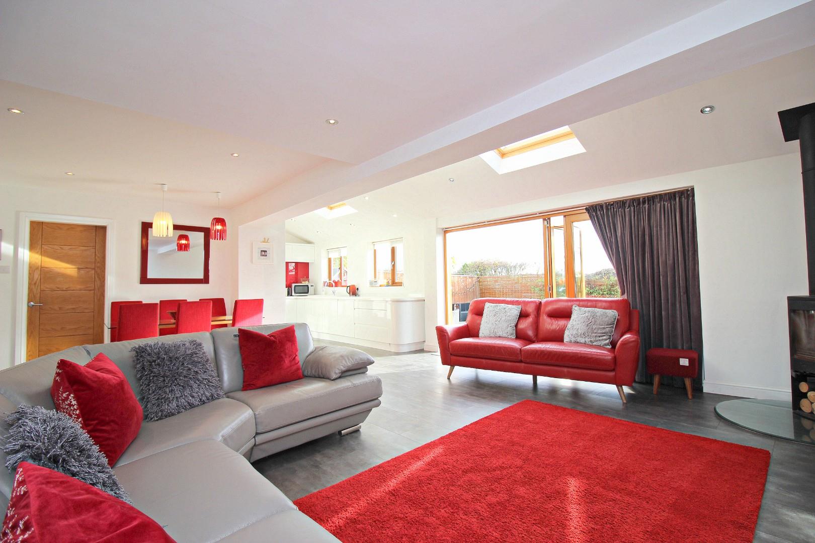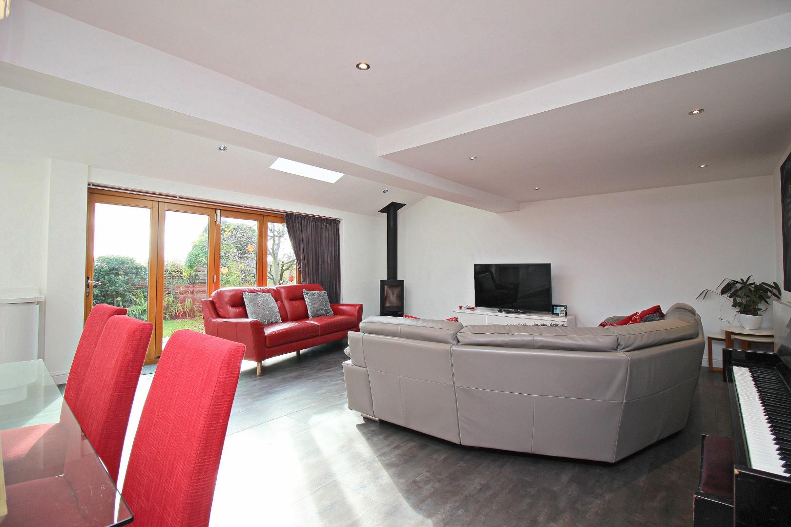 The floorplan is thoughtfully designed for family living, comprising: entrance lobby, hallway, lounge, and an absolutely fabulous kitchen and family room, complete with bi-fold doors opening onto the private rear garden. This bright, airy space features two Velux windows, a multi-fuel burning fire, and a stunning kitchen equipped with high-quality wall and base units. The ground floor is further complimented by a downstairs WC, a practical utility room, and an integral garage.