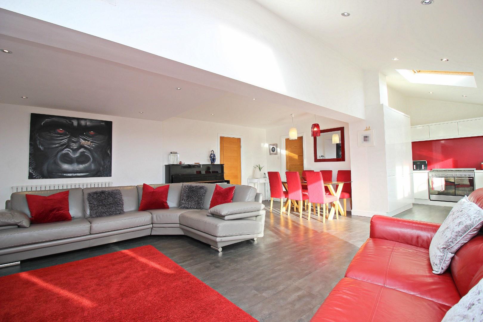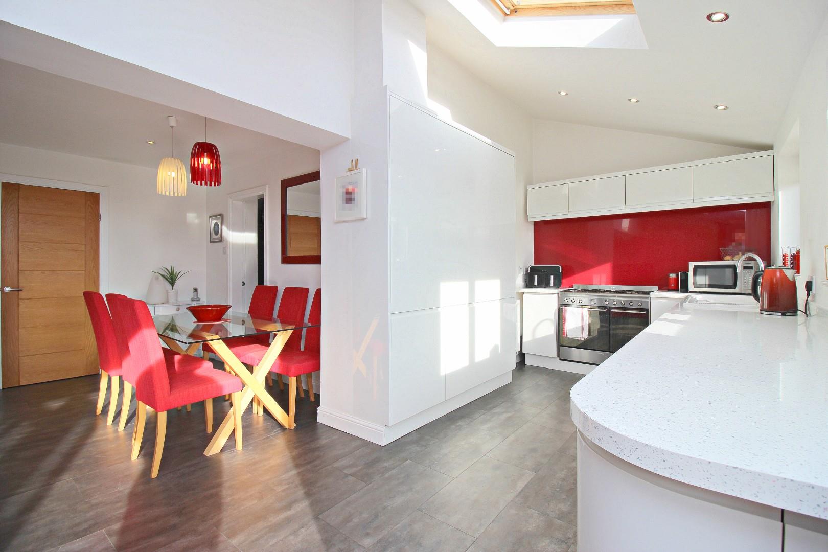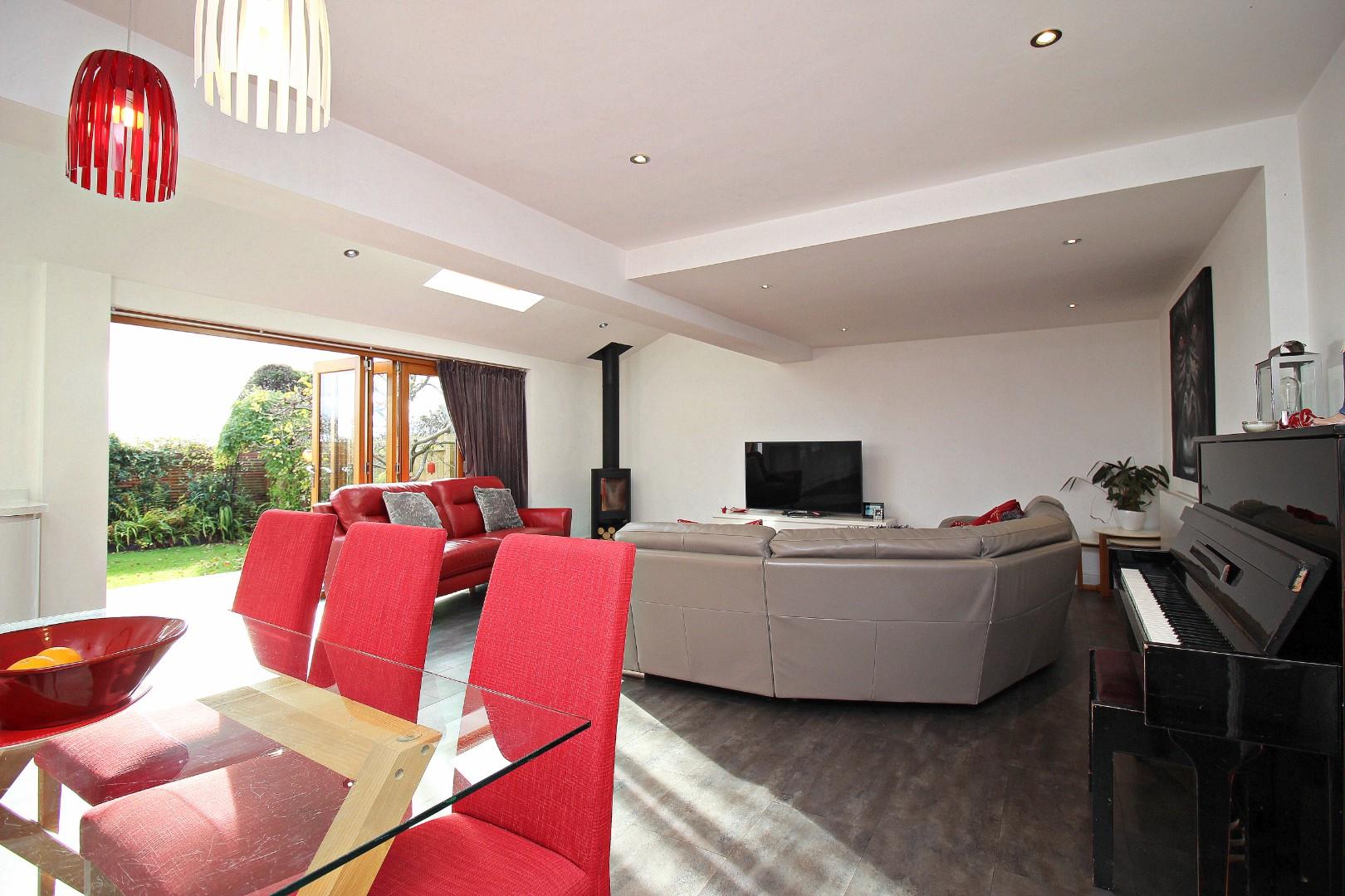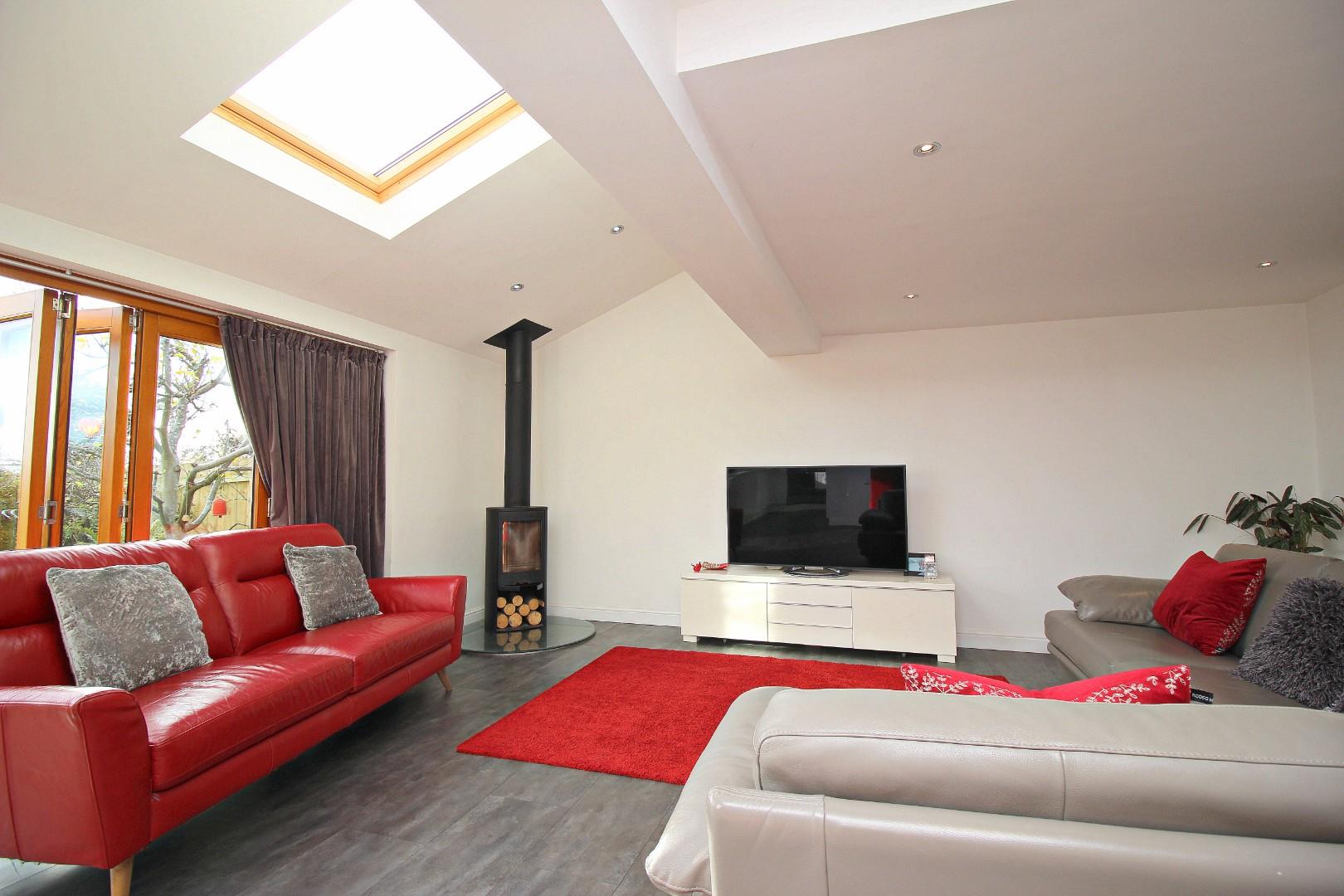 The floorplan is thoughtfully designed for family living, comprising: entrance lobby, hallway, lounge, and an absolutely fabulous kitchen and family room, complete with bi-fold doors opening onto the private rear garden. This bright, airy space features two Velux windows, a multi-fuel burning fire, and a stunning kitchen equipped with high-quality wall and base units. The ground floor is further complimented by a downstairs WC, a practical utility room, and an integral garage.