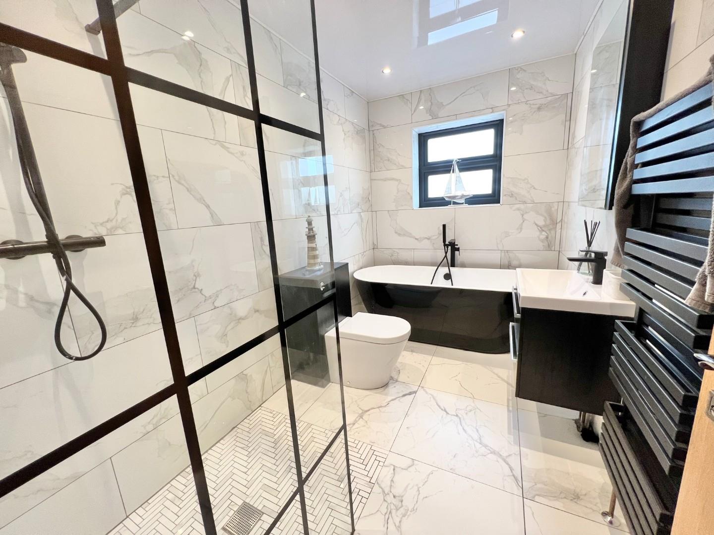 To the first floor there are four bedrooms, all having a range of fitted wardrobes and the main having an en-suite shower room with three piece suite, including a walk in shower enclosure. A family bathroom with four piece suite including a free standing bath and walk in shower enclosure.
