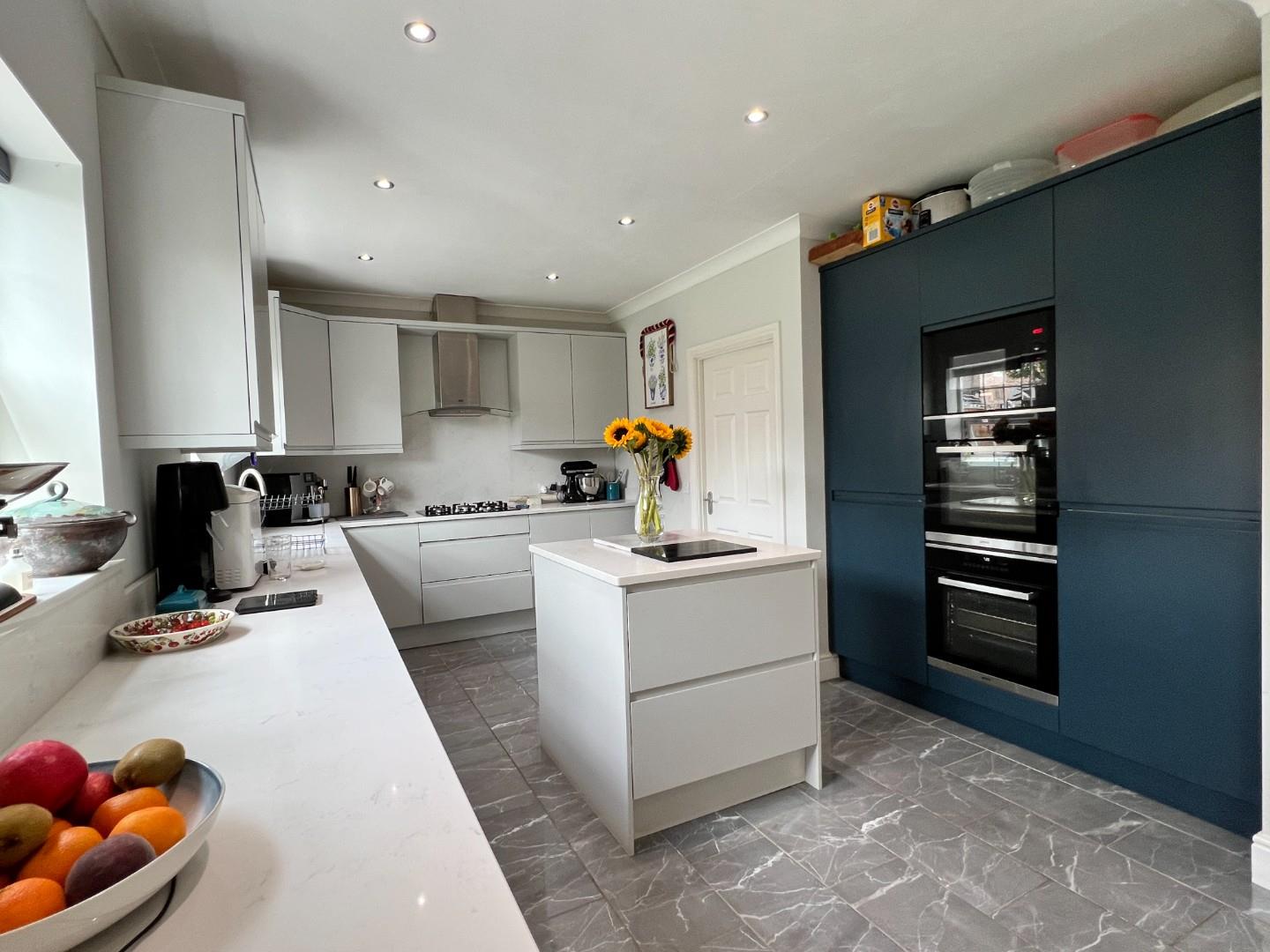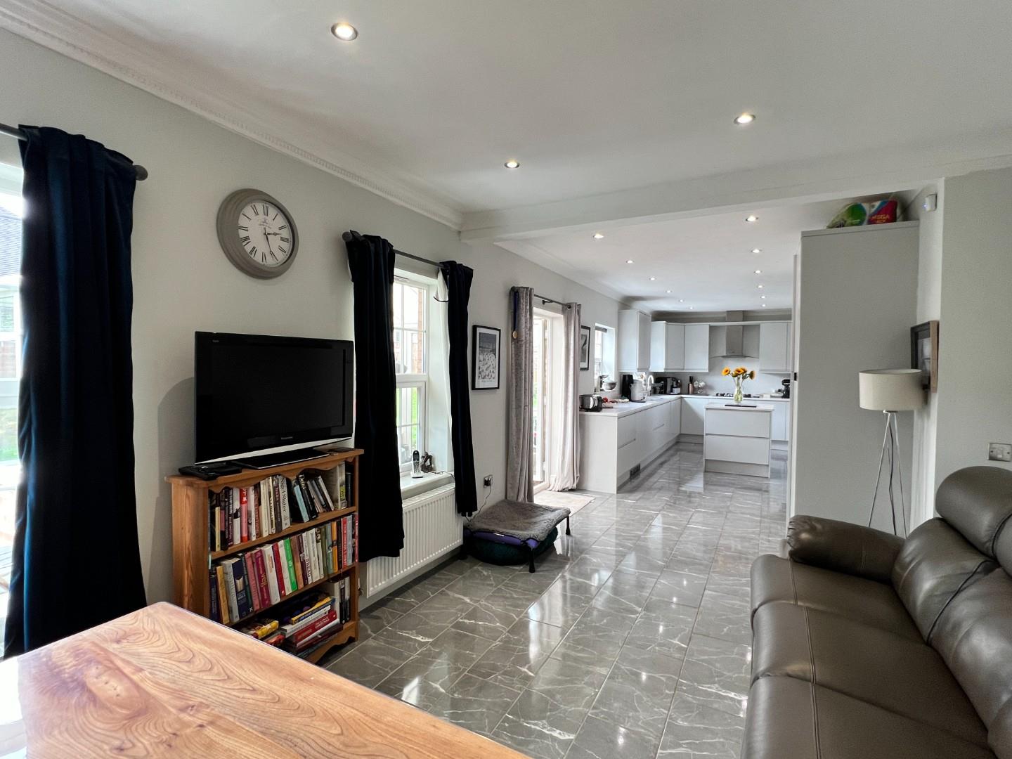 Upon entering, you are greeted by a grand entrance hall featuring oak flooring, setting a sophisticated tone. The ground floor boasts a bright and spacious lounge with a feature fireplace, perfect for cozy gatherings. Adjacent to the lounge, a separate family room or dining area provides additional versatile living space. At the rear of the property, the expansive open-plan kitchen/diner spans the full width of the house, creating an ideal family and entertainment area. The kitchen is equipped with a comprehensive range of two-tone units, a centre island, contrasting white quartz work surfaces, built-in appliances, and LVT flooring. Patio doors lead to a rear conservatory, seamlessly blending indoor and outdoor living. A separate utility room and a convenient downstairs WC complete the practical layout of the ground floor.