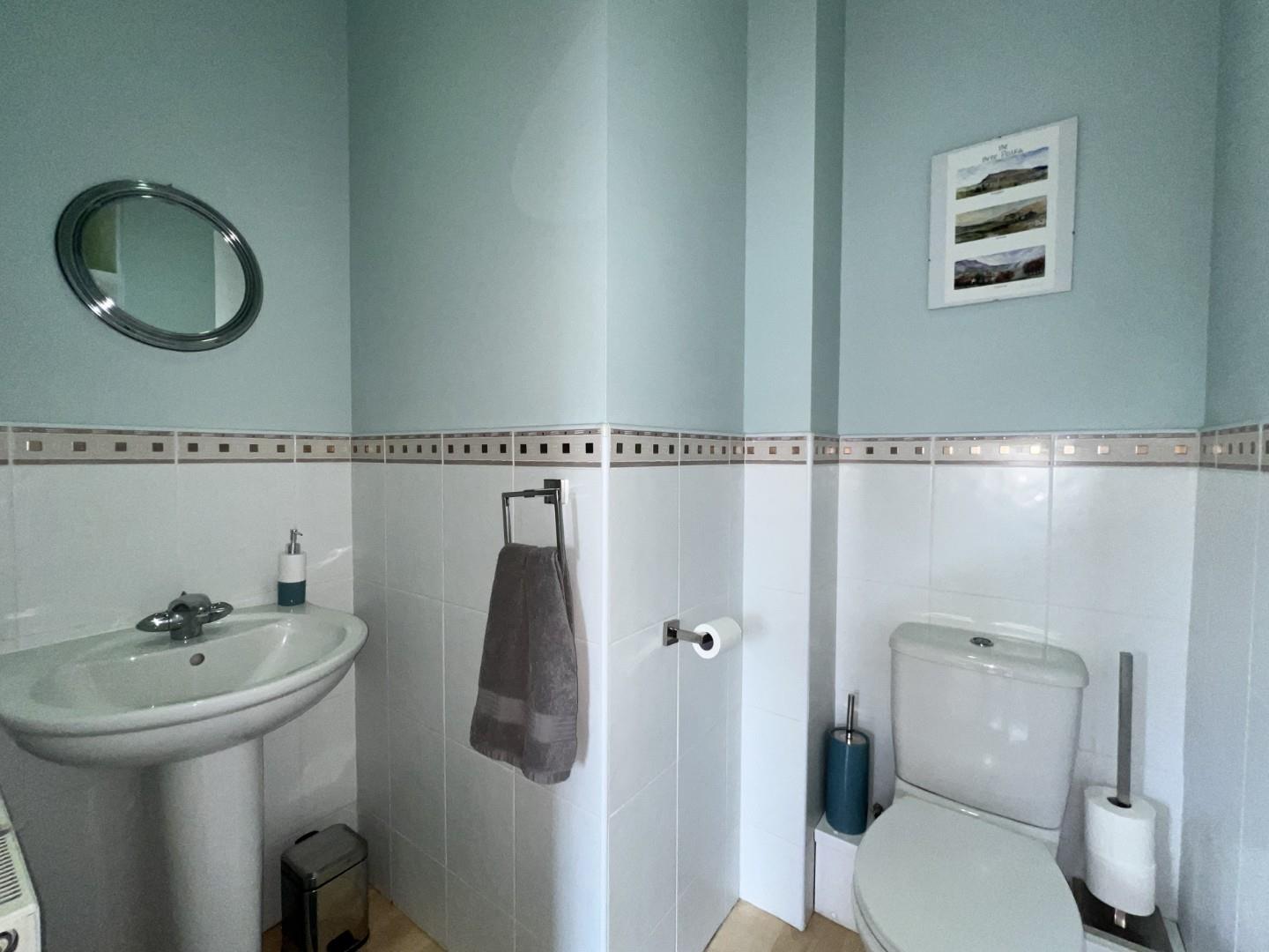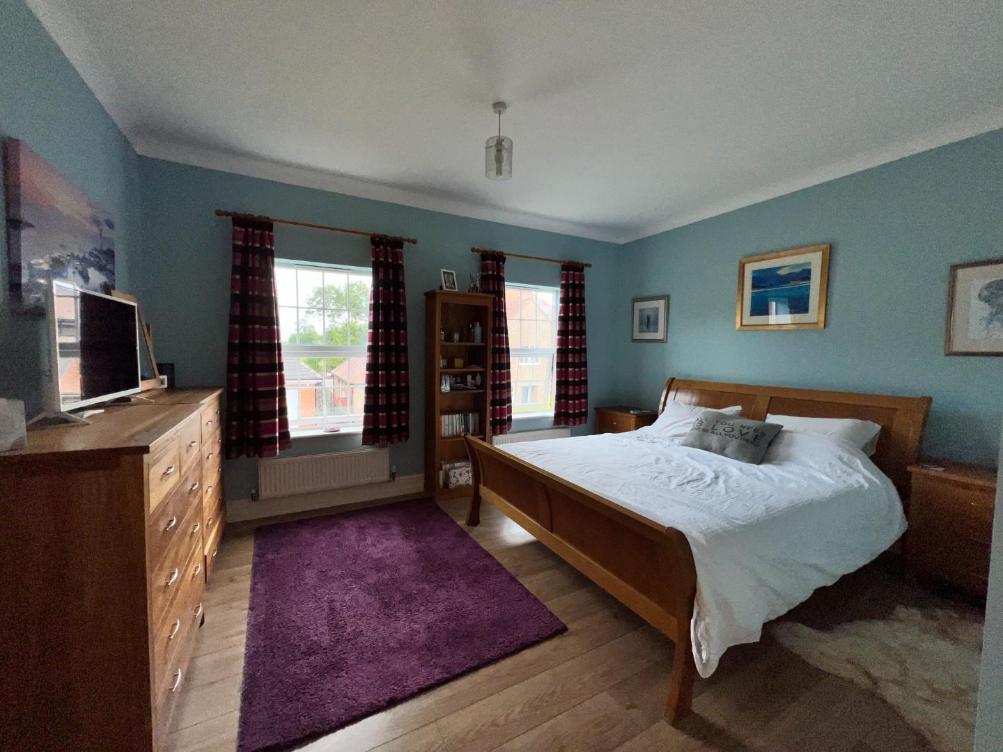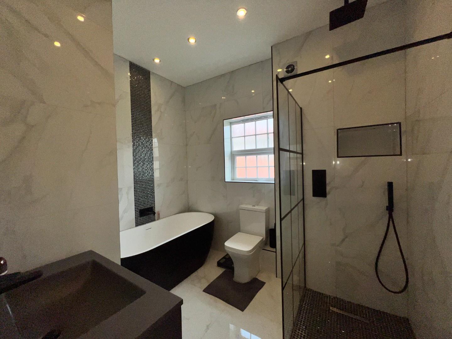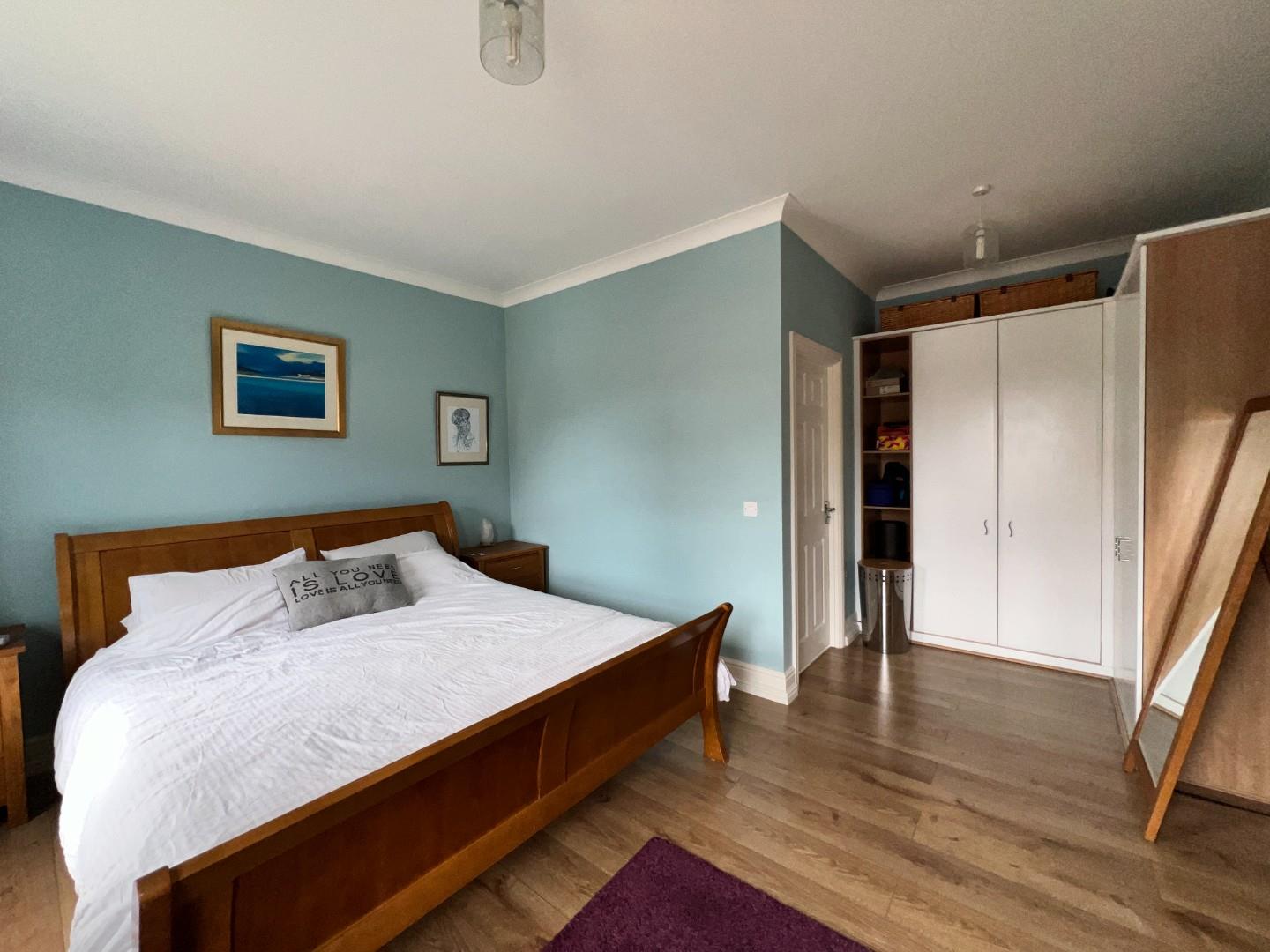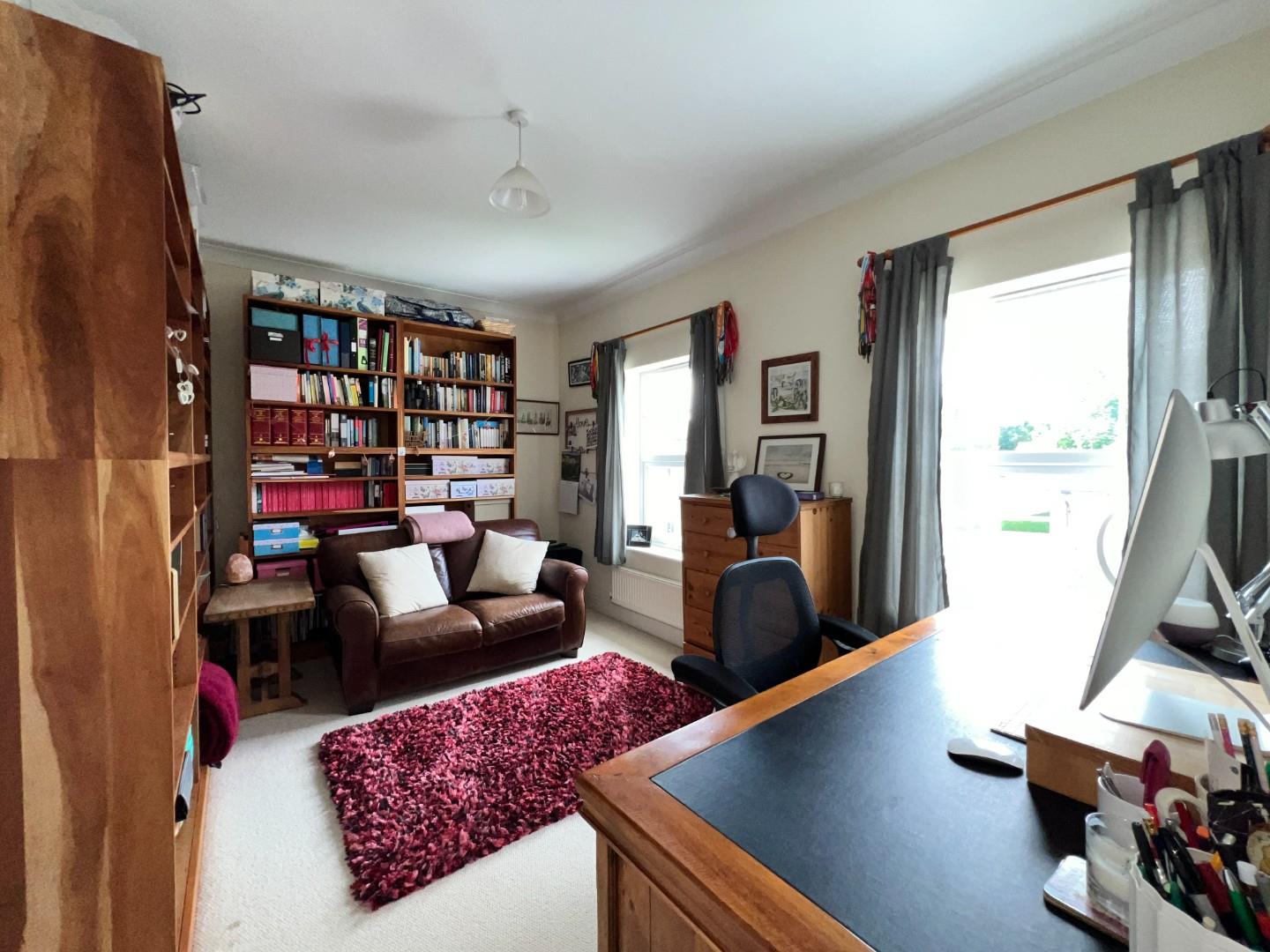The first floor is designed for comfort and privacy, featuring four double bedrooms. The master suite includes a dressing area with wardrobes and a fully tiled, modern en-suite bathroom. The second bedroom also benefits from en-suite facilities, making it an ideal guest suite. Two additional double bedrooms and a single bedroom, currently utilized as a study with a 'Juliet' balcony, offer ample space for family members or guests. These rooms are serviced by a fully tiled, contemporary family bathroom with a freestanding tub, adding a touch of luxury.