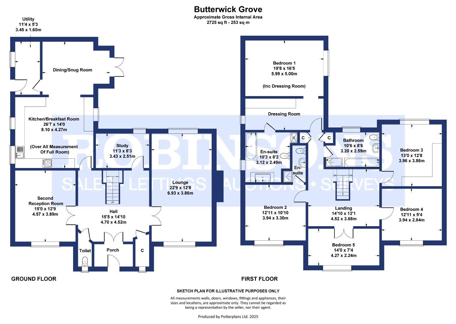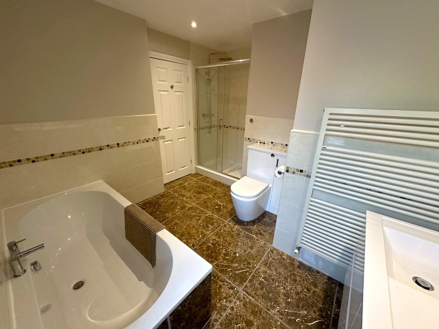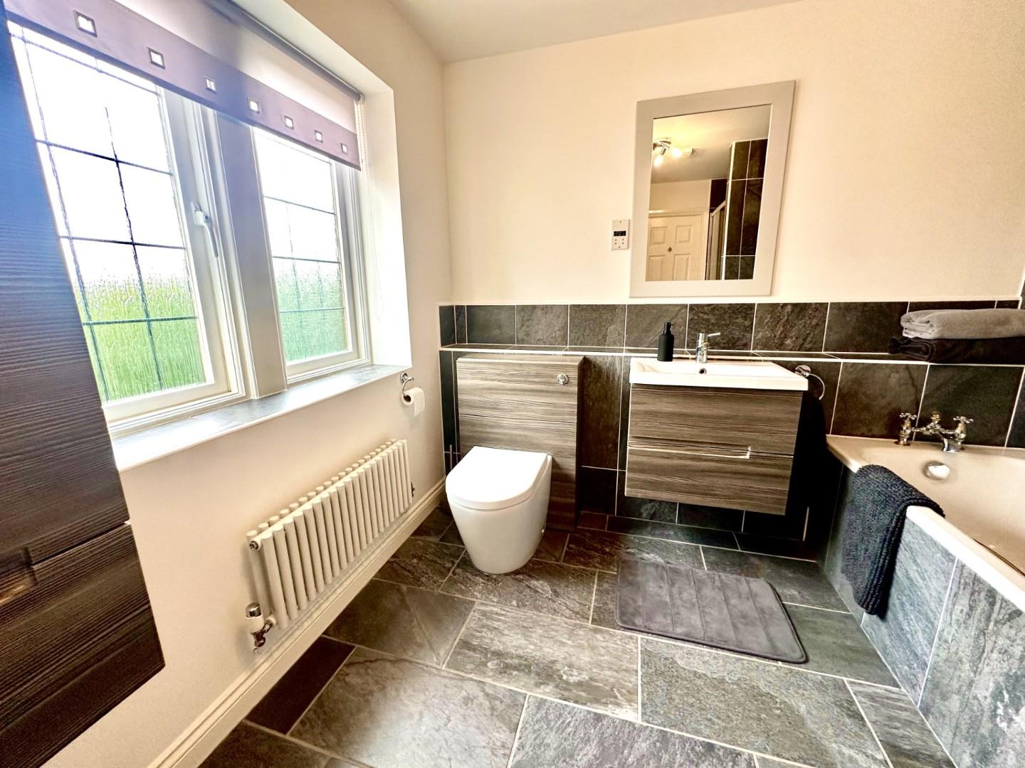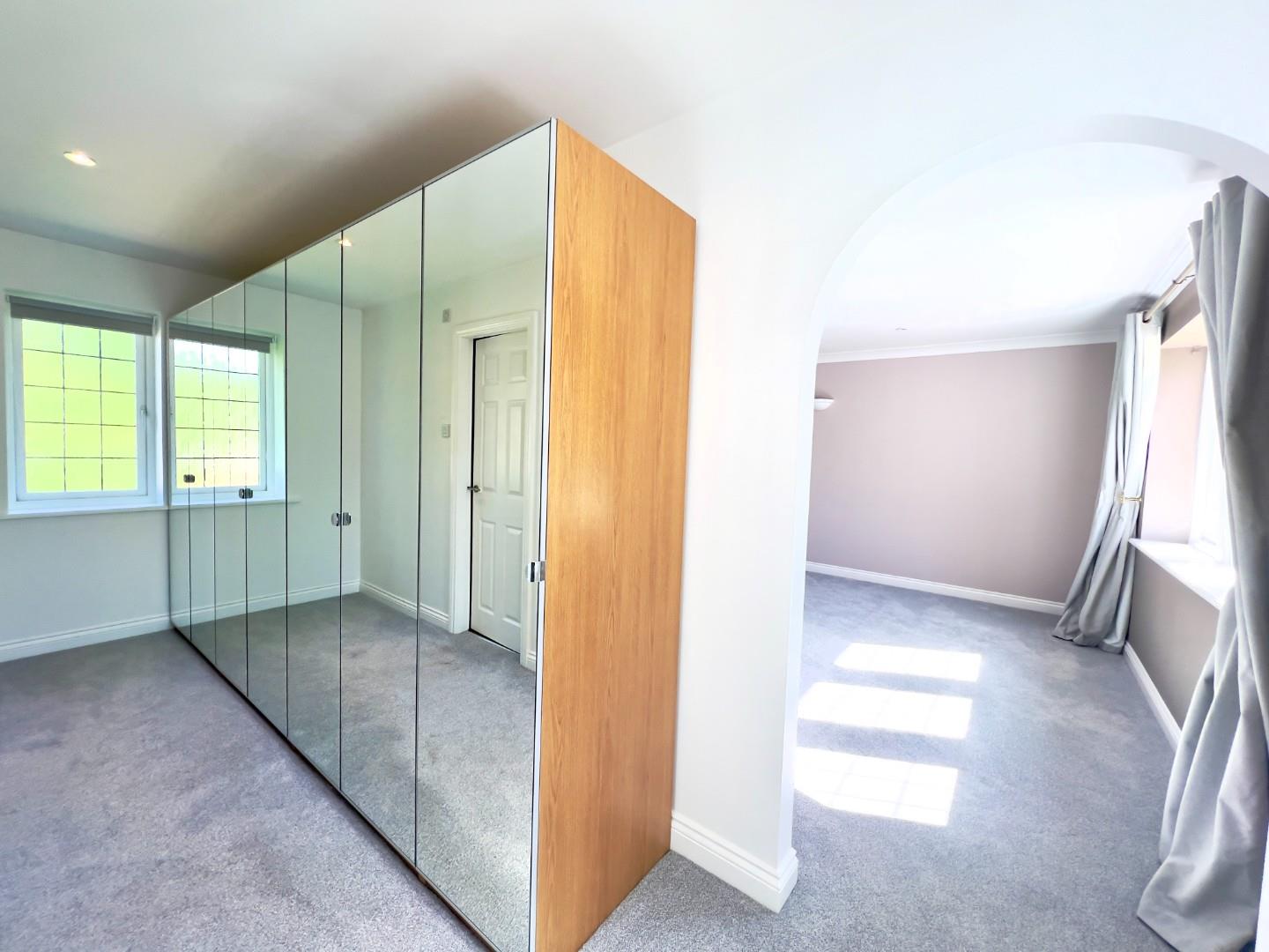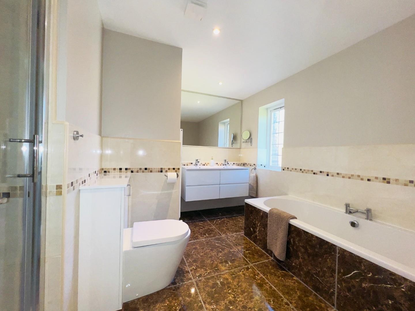 Upstairs, the expansive master suite is light and airy, complete with its own dressing room and a luxurious en-suite with both a bath and shower facilities. A further guest bedroom also benefits from en-suite facilities, while two additional bedrooms are served by a modern family bathroom. An additional room with double doors offers versatility as a fifth bedroom, second study, or library.