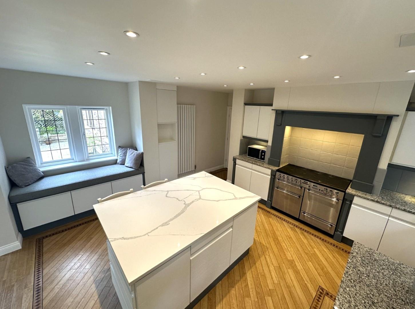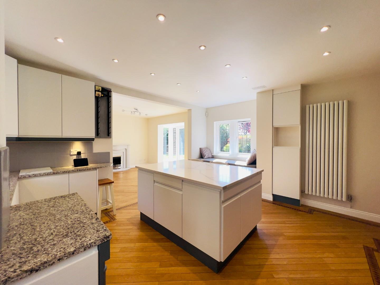 At the heart of the property is a stunning open-plan kitchen and family area, designed for modern living. Bathed in natural light from a bay window and French doors that open to the rear garden, this space is both stylish and functional. The kitchen features sleek, handleless cabinetry with granite work surfaces, a central island with breakfast bar, and a range of integrated appliances, including a double range oven with warming drawer and a five-ring gas hob. A practical utility room is set just off the kitchen for added convenience.