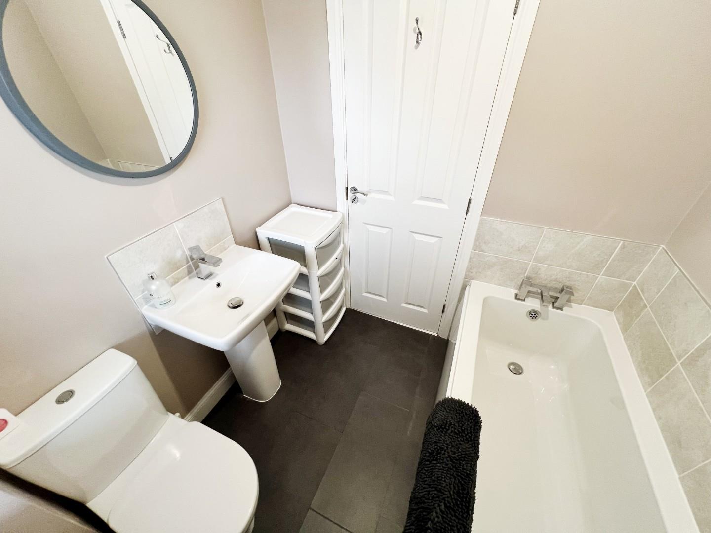 White panelled bath, wash hand basin, W/C, tiled splashbacks, uPVC window, radiator, extractor fan.