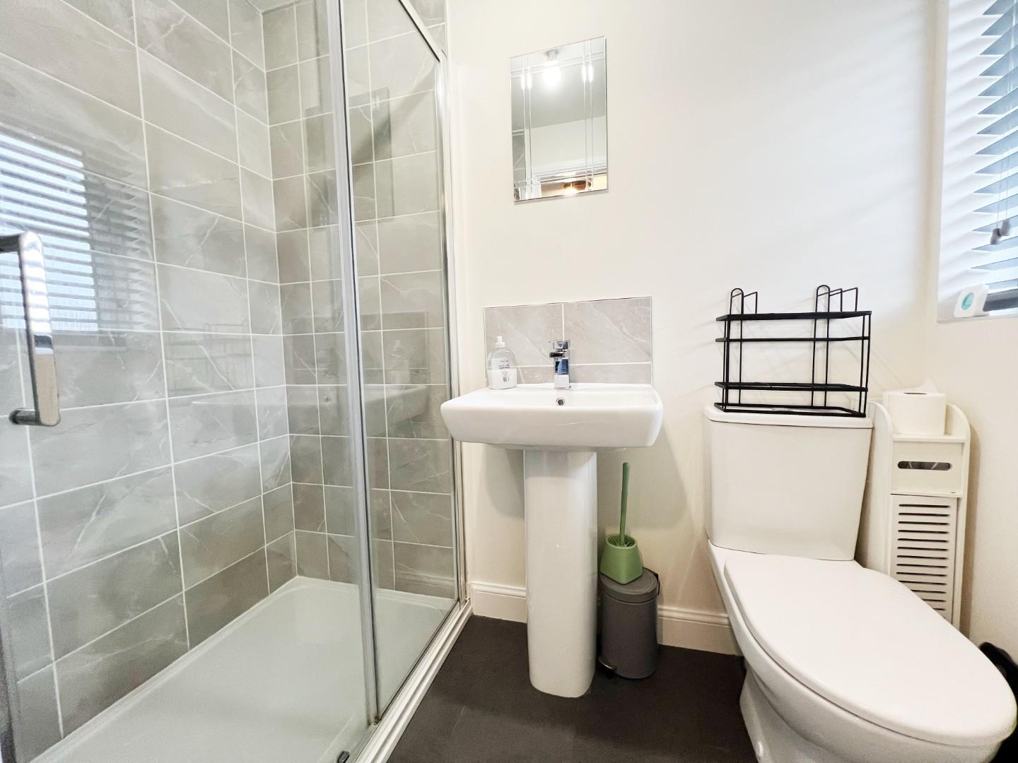 Double shower cubicle, wash hand basin, W/C, radiator, uPVC window, tiled splashbacks.