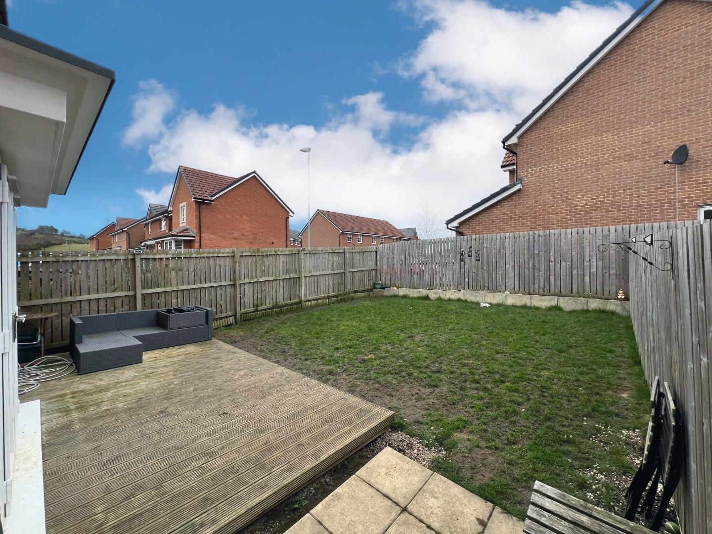 To the front elevation is a good sized, easy to maintain garden and double driveway which leads to a garage. While to the rear, there is a good sized enclosed garden and decked area.