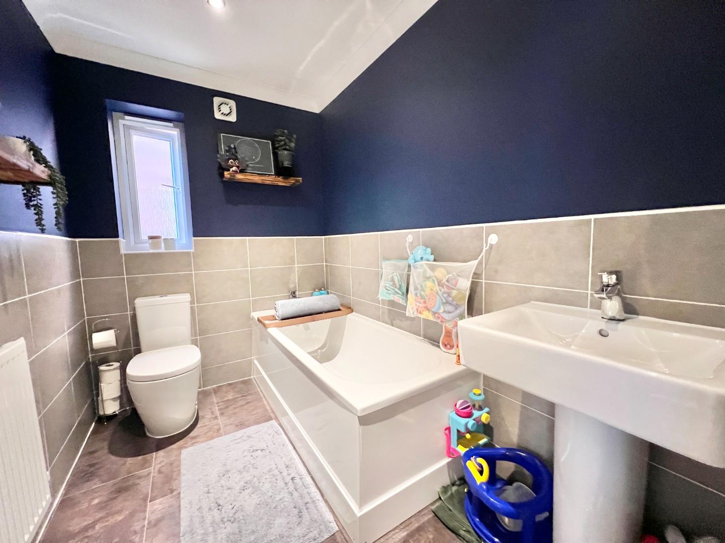 To the first floor there are three double bedrooms, the two larger having fitted wardrobes and the main having an en-suite shower room. Family bathroom with three piece suite.
