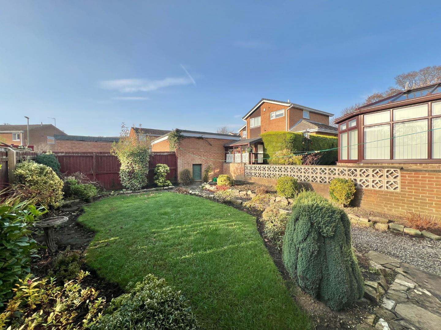 Outside the house has garden and driveway leading to the garage at the front of the house. The rear garden is enclosed with lawn area and flower beds.