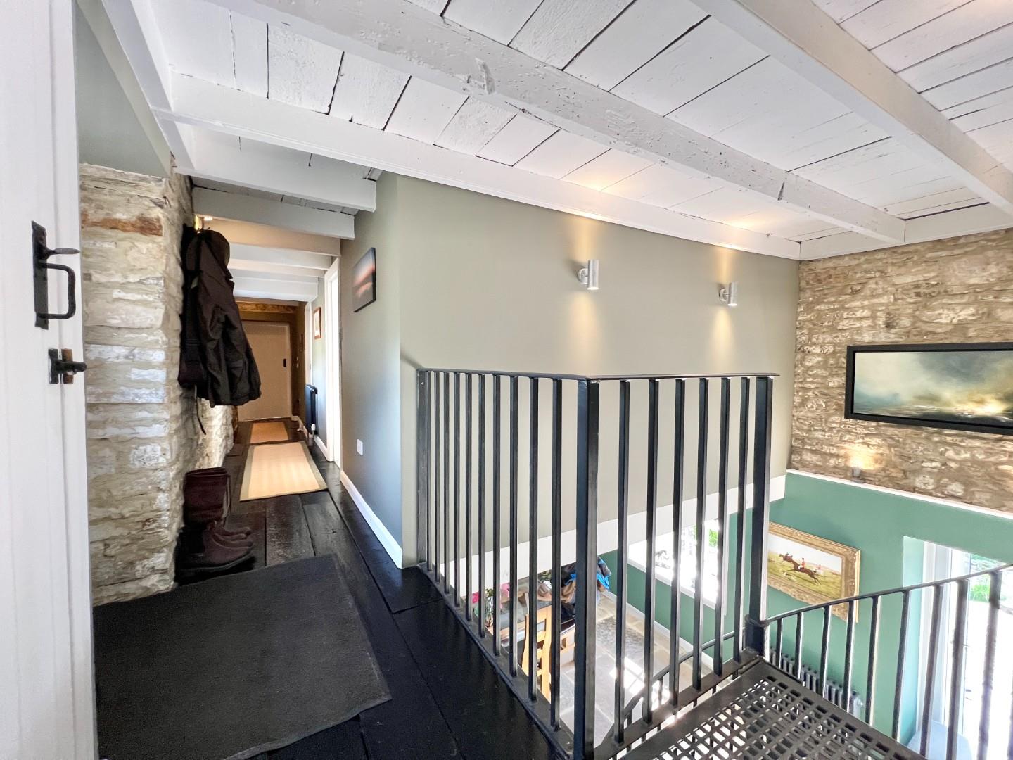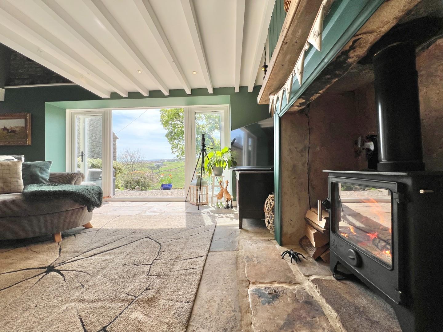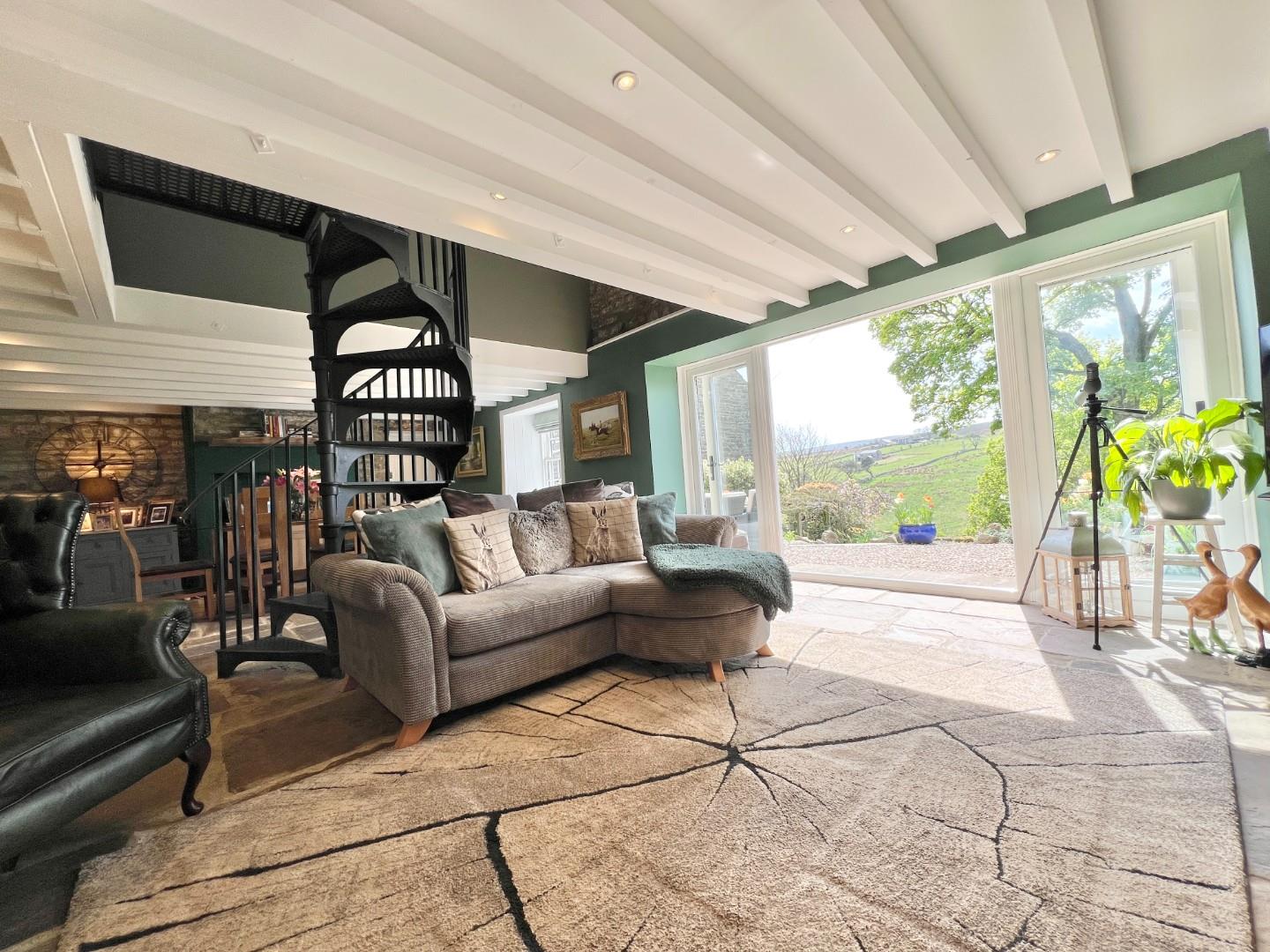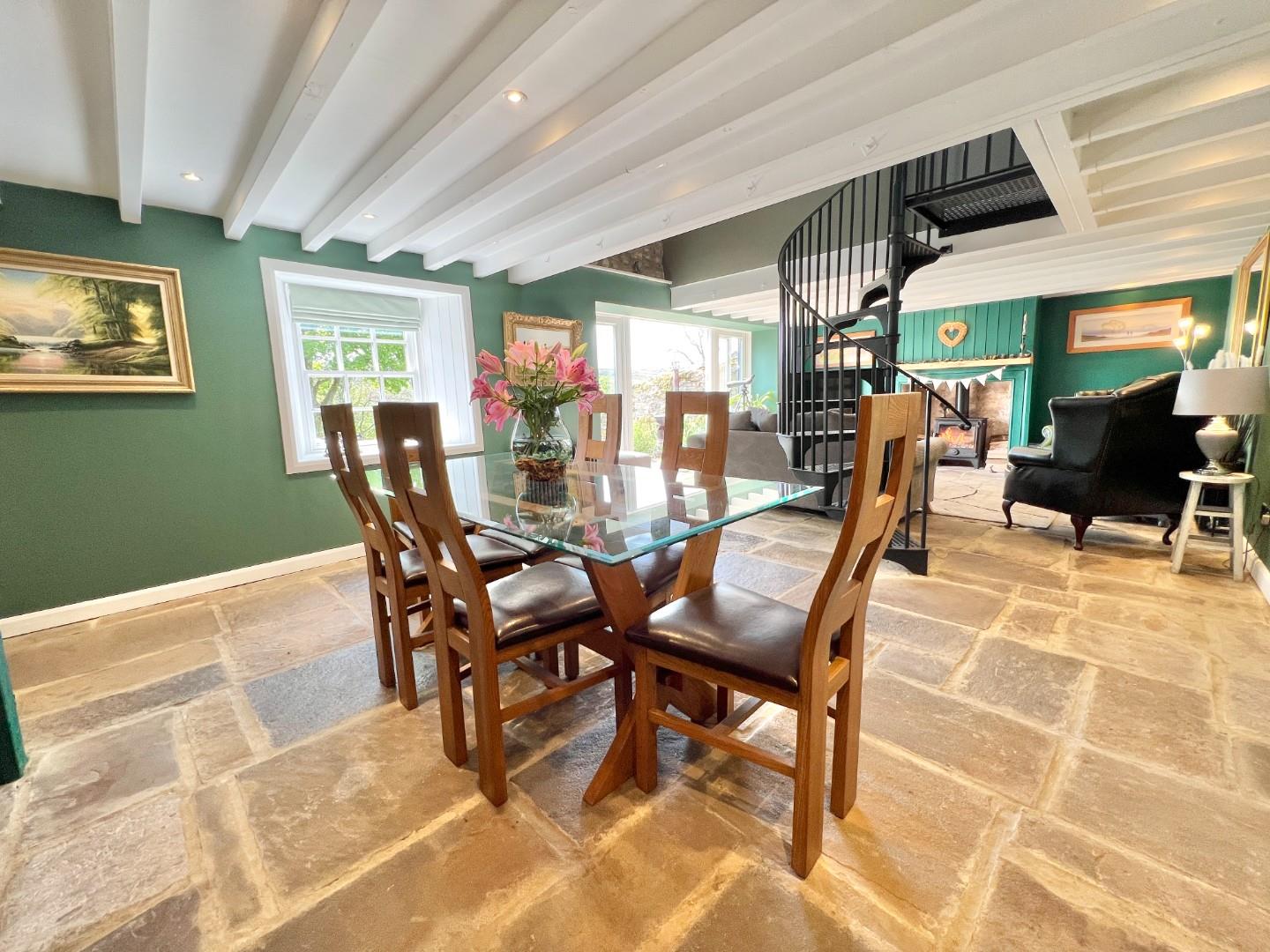 The open plan lounge/dining room is a perfect room for entertaining guests and has a large set of patio doors opening to the garden and enjoys far-reaching views. This room has a further solid fuel stove and a spiral staircase leading to the upper floor.