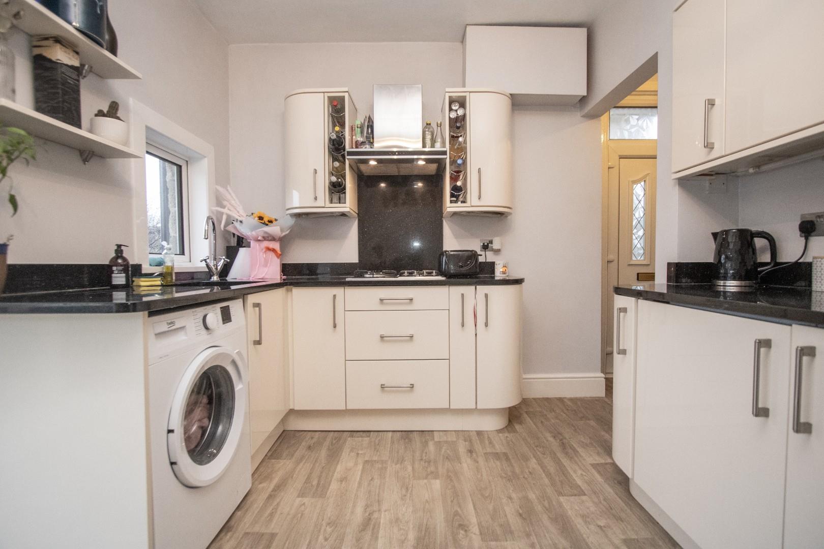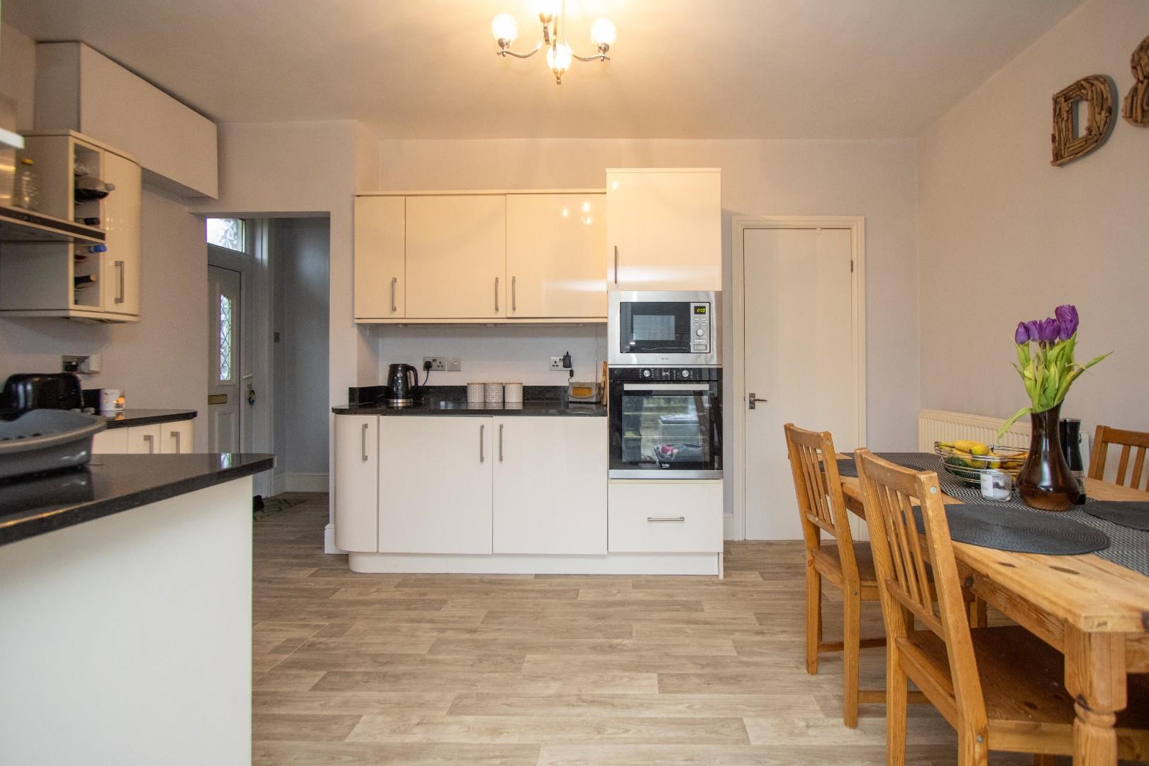 An entrance hallway with stairs leading to the first floor, and a comfortable lounge featuring a front bay window and a feature fireplace. The superbly fitted kitchen and dining room includes a range of modern soft-close wall and base units, complemented by granite work surfaces. Integrated appliances include a fridge and freezer, microwave, oven, and a four-ring gas hob with an extractor hood. There is ample space for a dining table and chairs, plus an additional rear seating area overlooking the garden. A door opens directly onto the garden and patio, creating an ideal space for alfresco dining.
