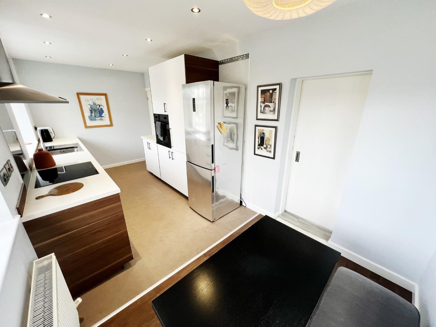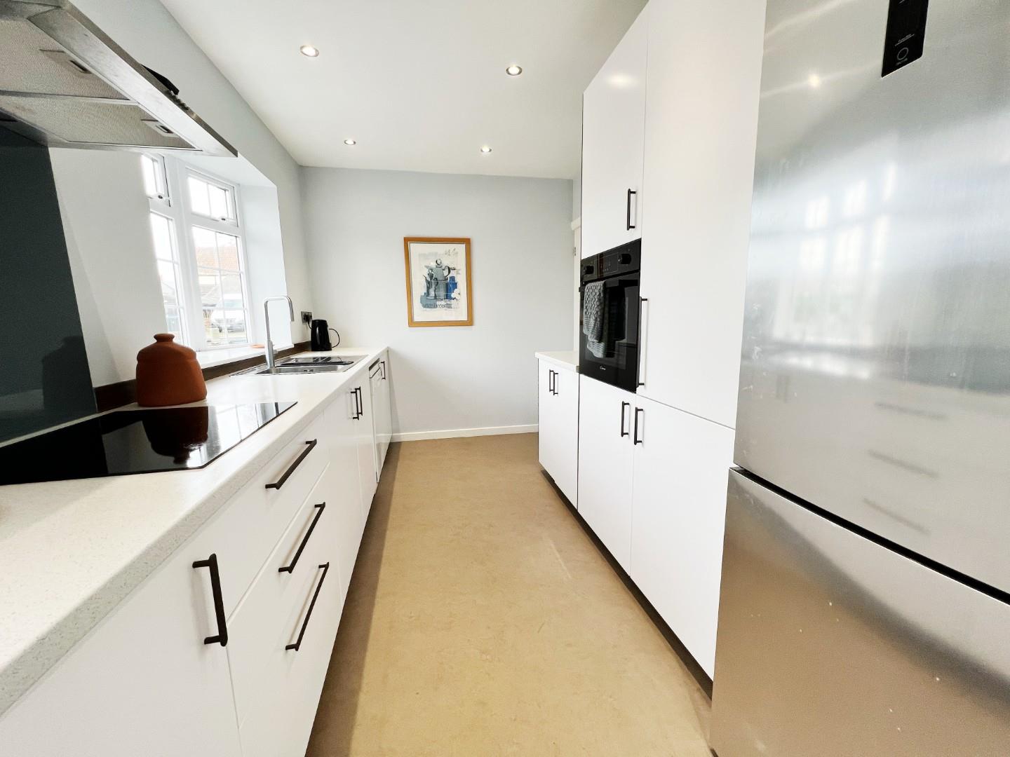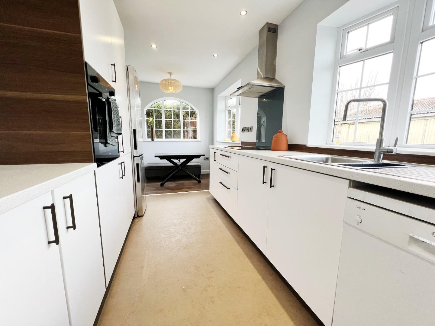 Modern wall and base units, integrated oven, hob, extractor fan, plumbed for dishwasher, stainless steel sink with mixer tap and drainer, two uPVC bay windows, radiator, space for dining room table, spotlights, uPVC window, space for fridge freezer.