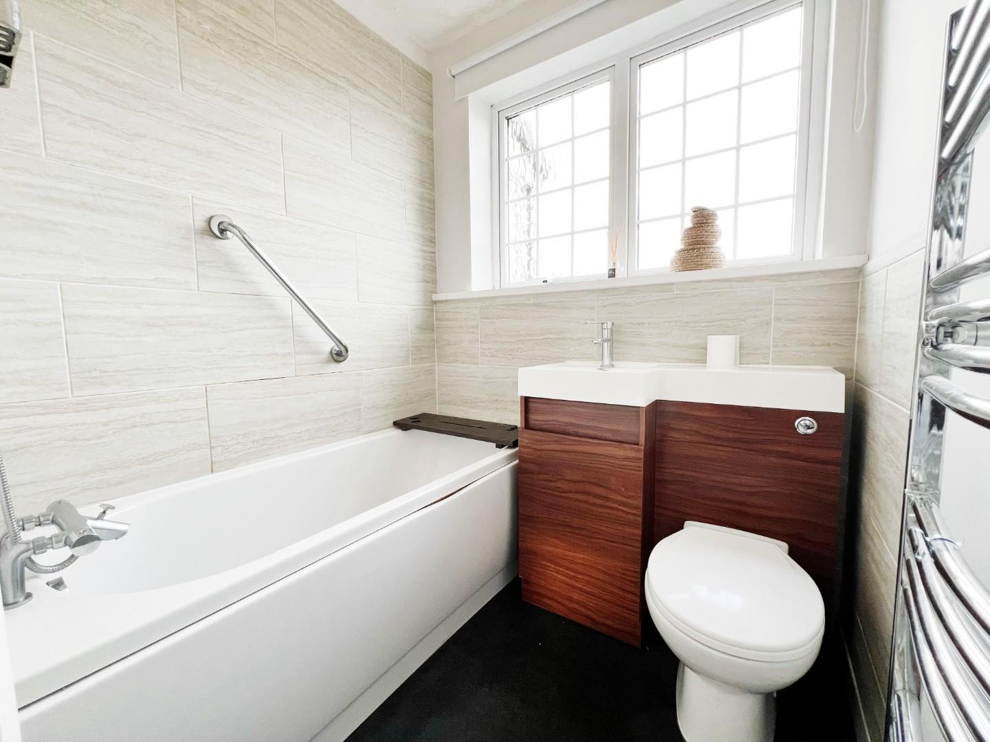 White panelled bath with shower over, wash hand basin, W/C, uPVC window, chrome towel radiator.