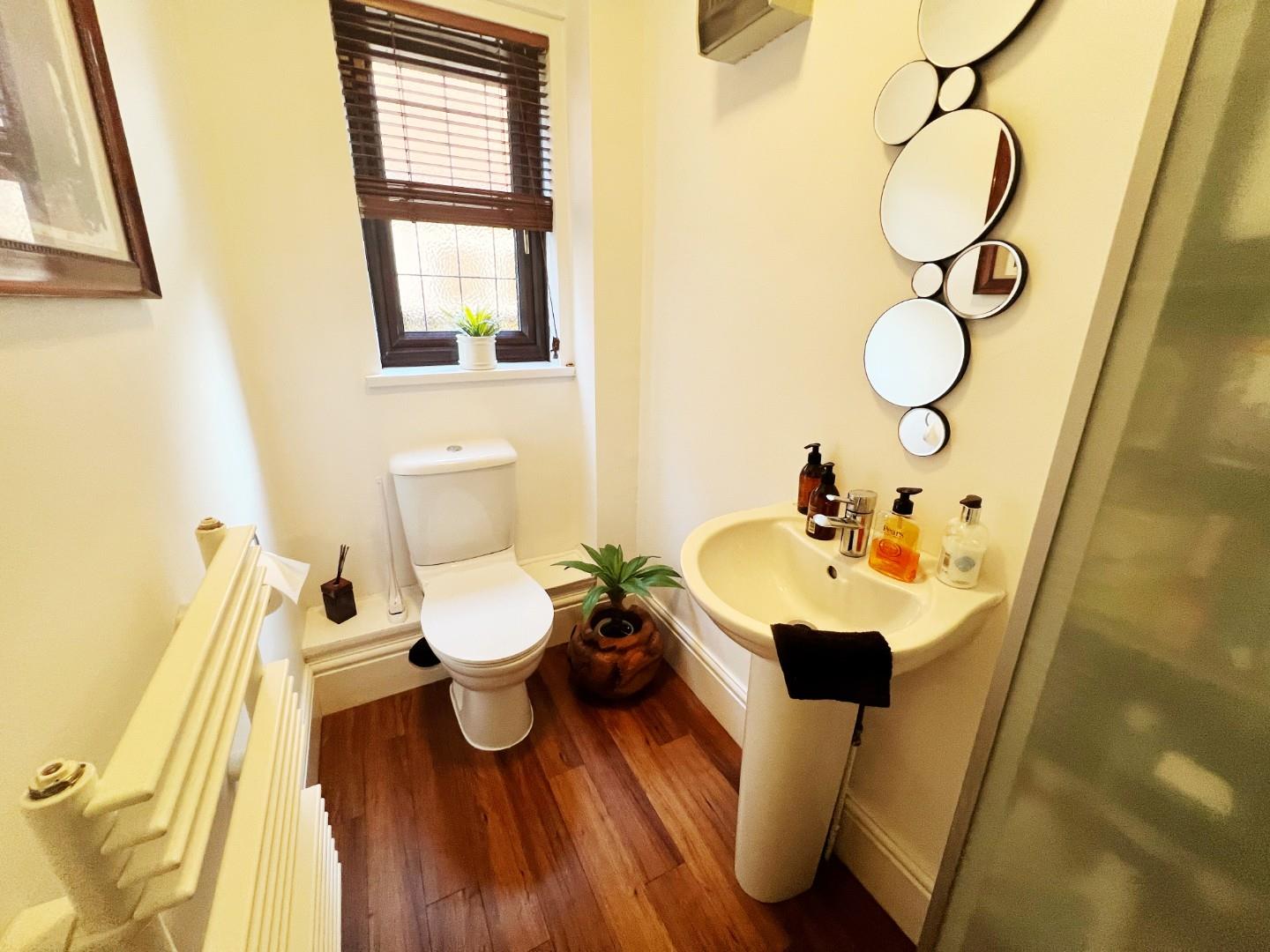 W/C, wash hand basin, hand towel radiator, uPVC window, stylish flooring.