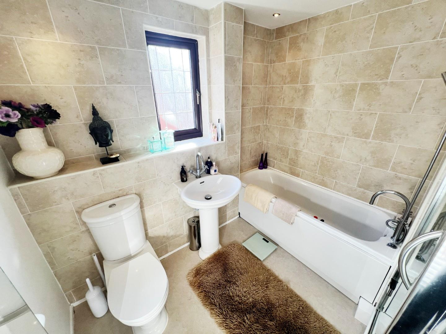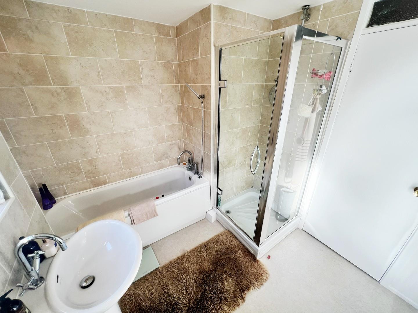 White panelled bath, shower cubicle, wash hand basin, w/c, chrome towel radiator, uPVC window, spotlights, extractor fan.