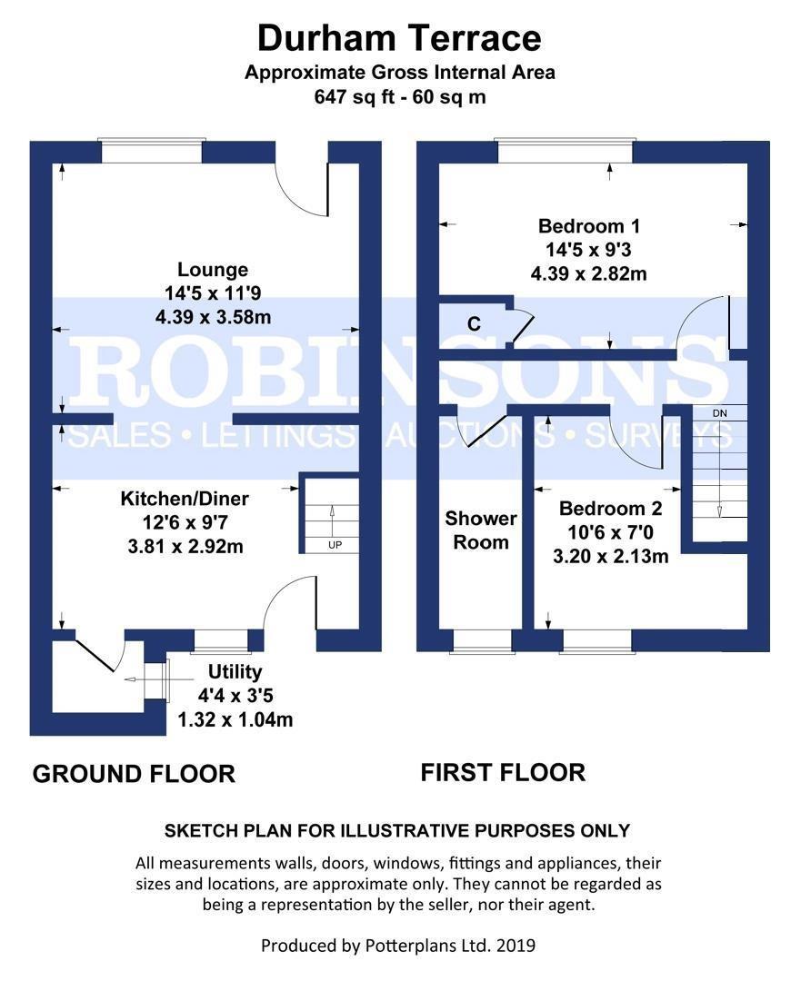 The floor plan comprises: entrance, lounge, kitchen diner, utility area. The first floor has two bedrooms and shower room/wc. Outside is a front garden, small rear courtyard and parking space.