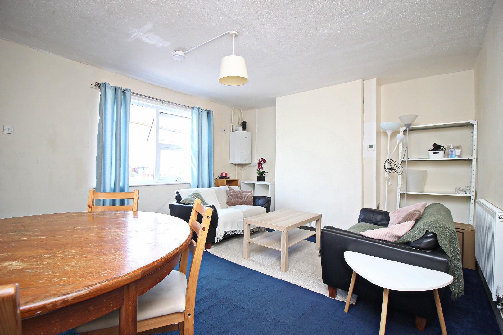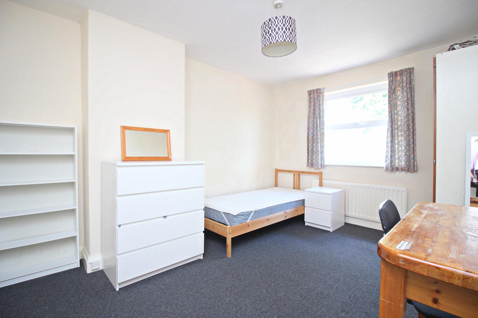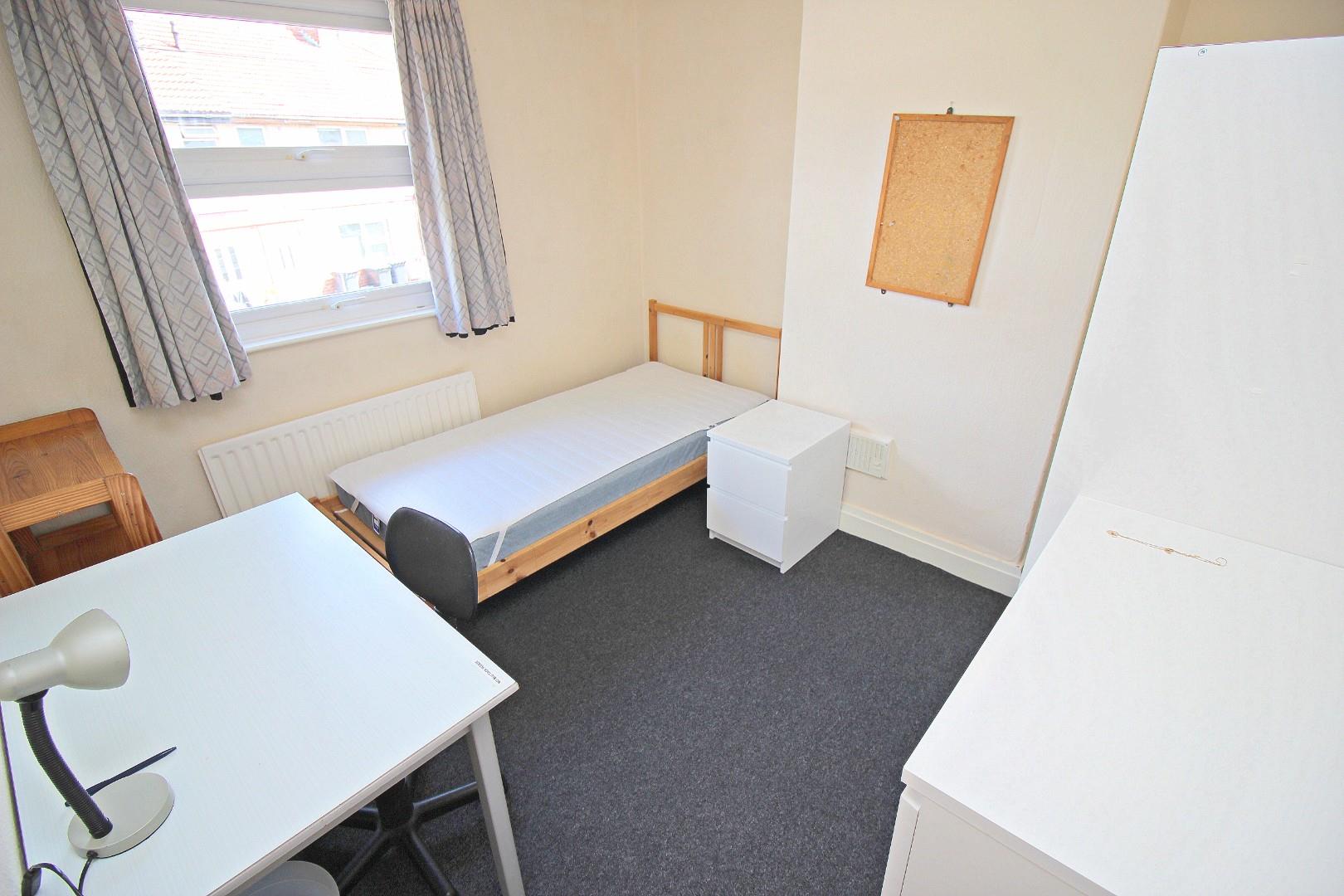 The internal layout comprises an entrance hall, spacious living room, fitted kitchen, and a ground floor bedroom. To the first floor there are three further bedrooms and a bathroom with a white suite. The layout is ideal for students, offering four good-sized study bedrooms, comfortable communal space, and a practical kitchen and bathroom setup. It also has a large rear garden and small front garden.
