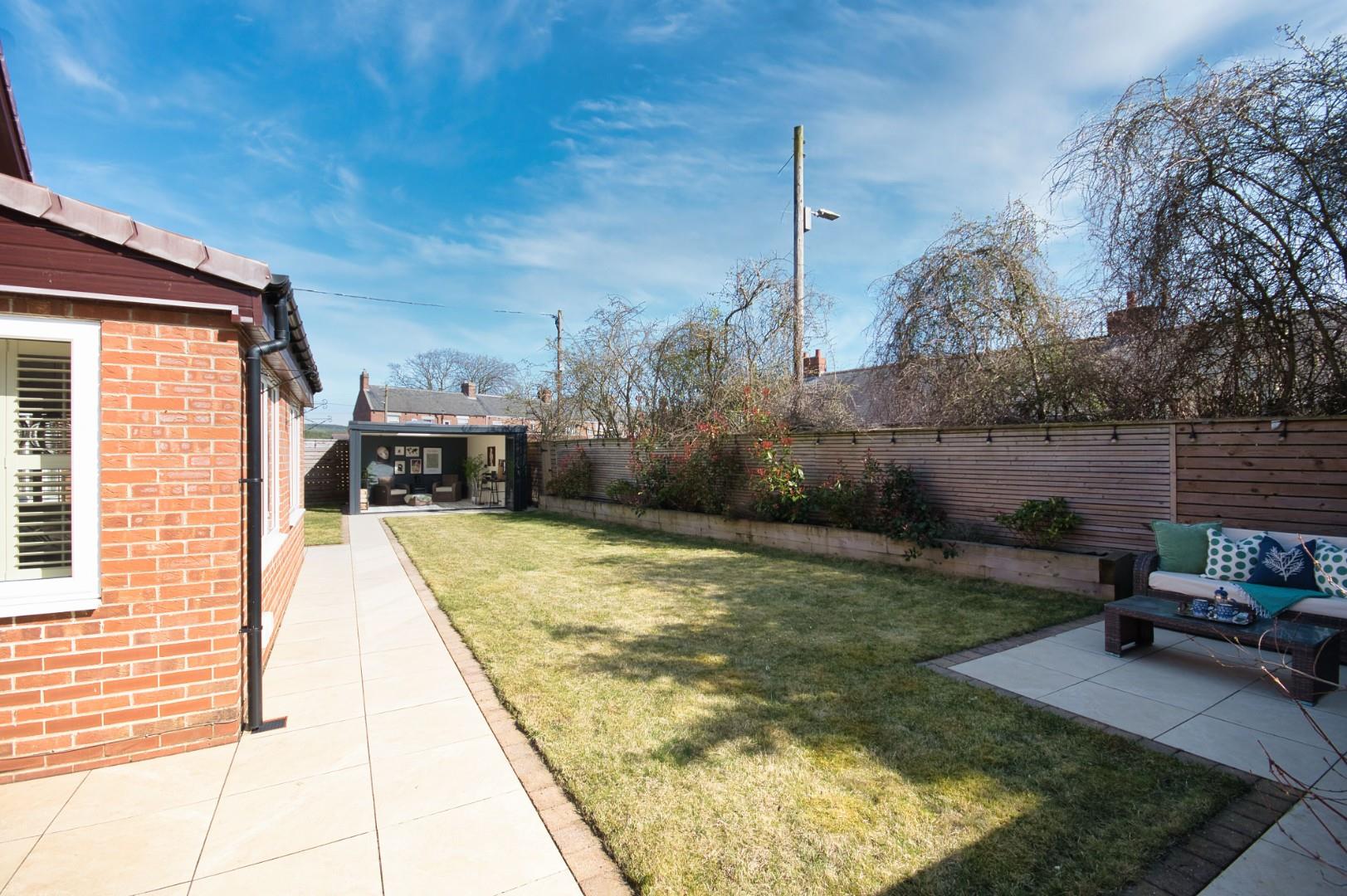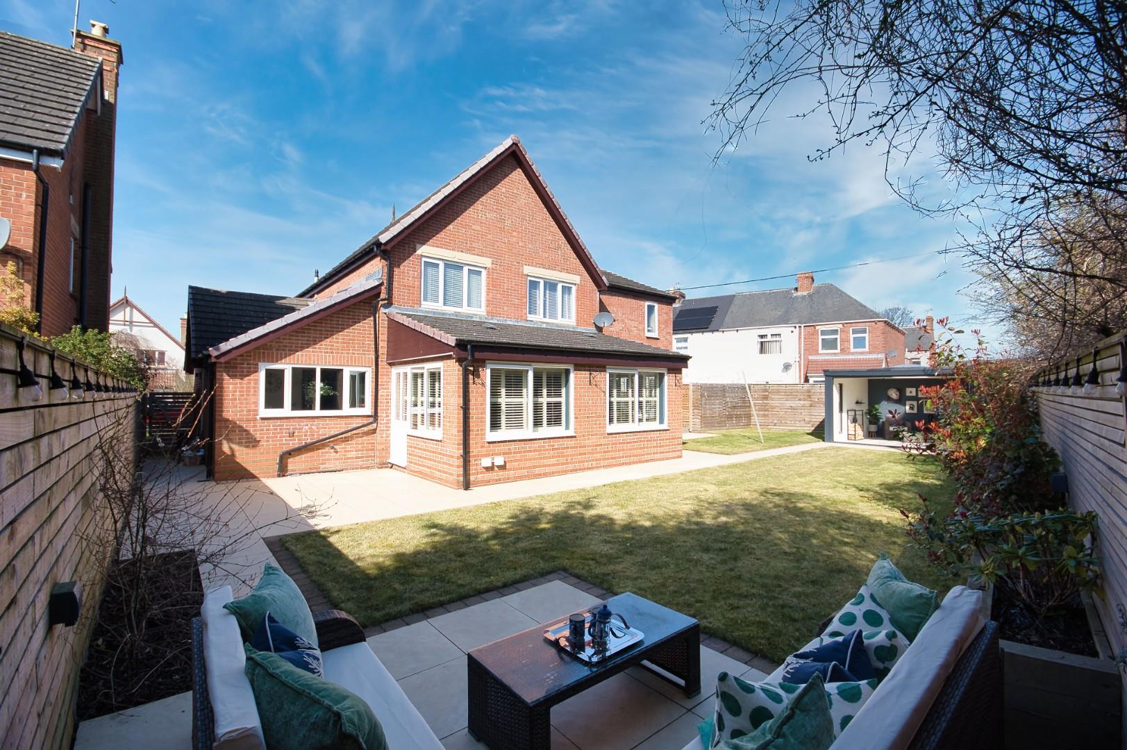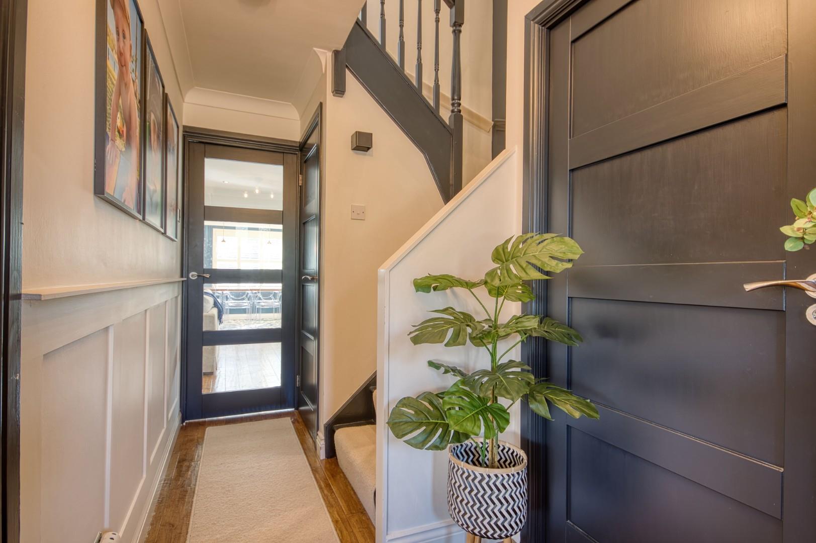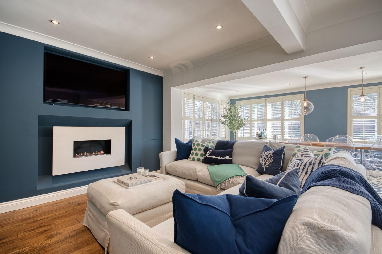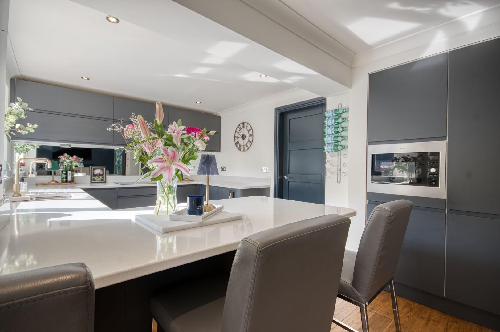 The floor plan features an inviting entrance hall with cloakroom/WC, a cosy sitting room centred around a stylish bioethanol fire, and a stunning open-plan kitchen, dining, and living area that flows effortlessly into the garden—perfect for entertaining. The kitchen is equipped with integrated appliances and is complemented by a practical boot/utility room.