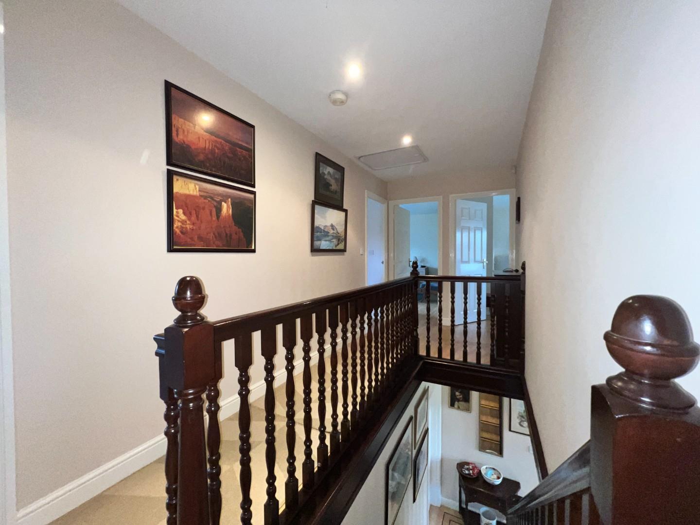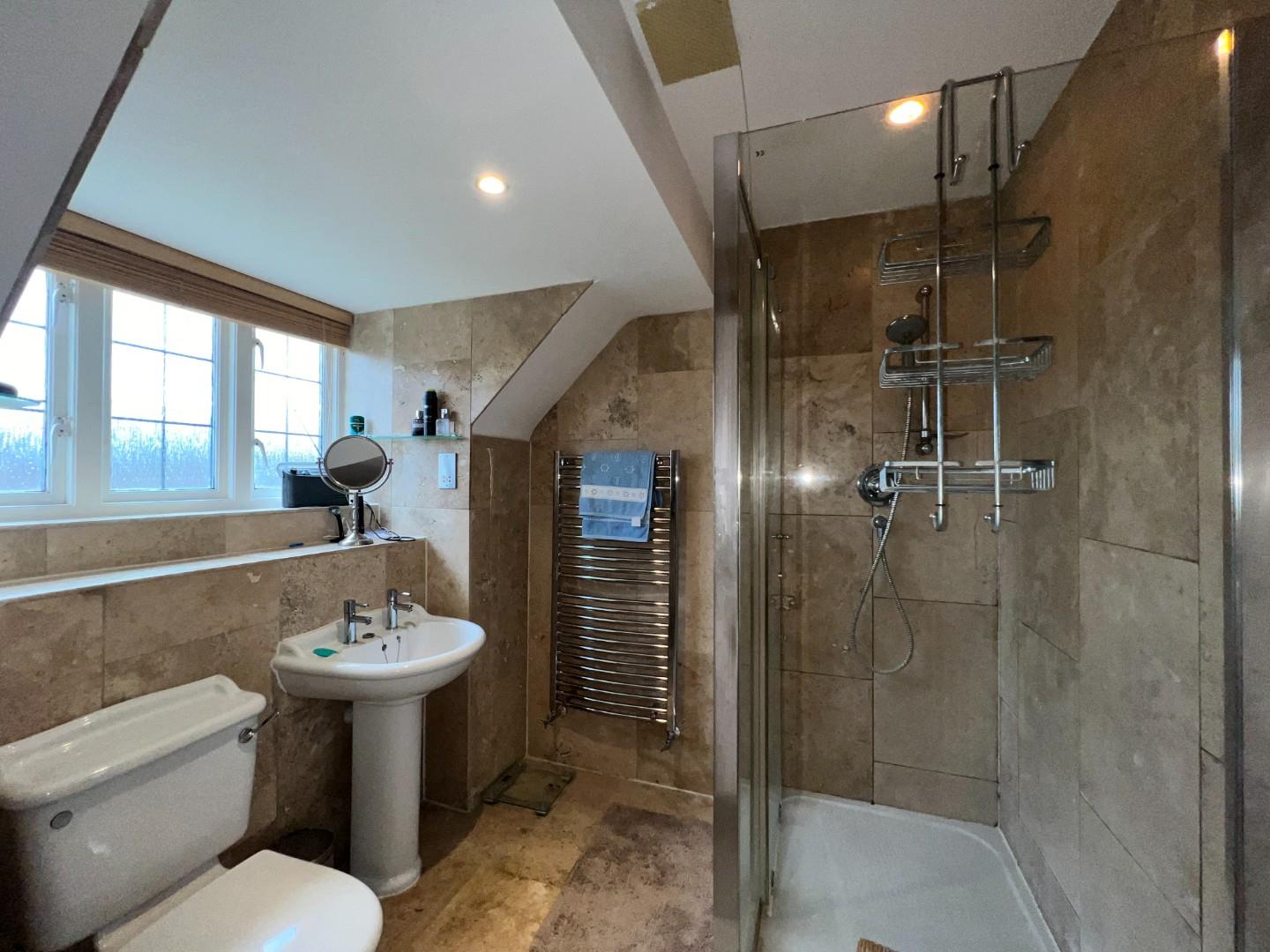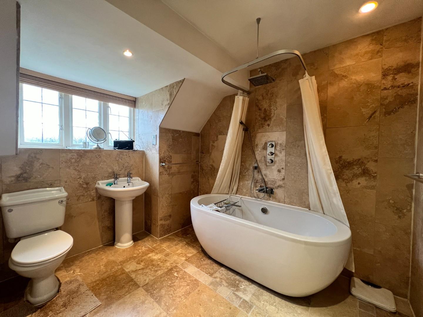 Upstairs, the master bedroom impresses with its generous proportions, a dedicated dressing area, and en-suite facilities. A second bedroom also benefits from an en-suite, while the remaining three bedrooms share a beautifully appointed family bathroom, featuring a freestanding tub and travertine-tiled walls for a touch of luxury.