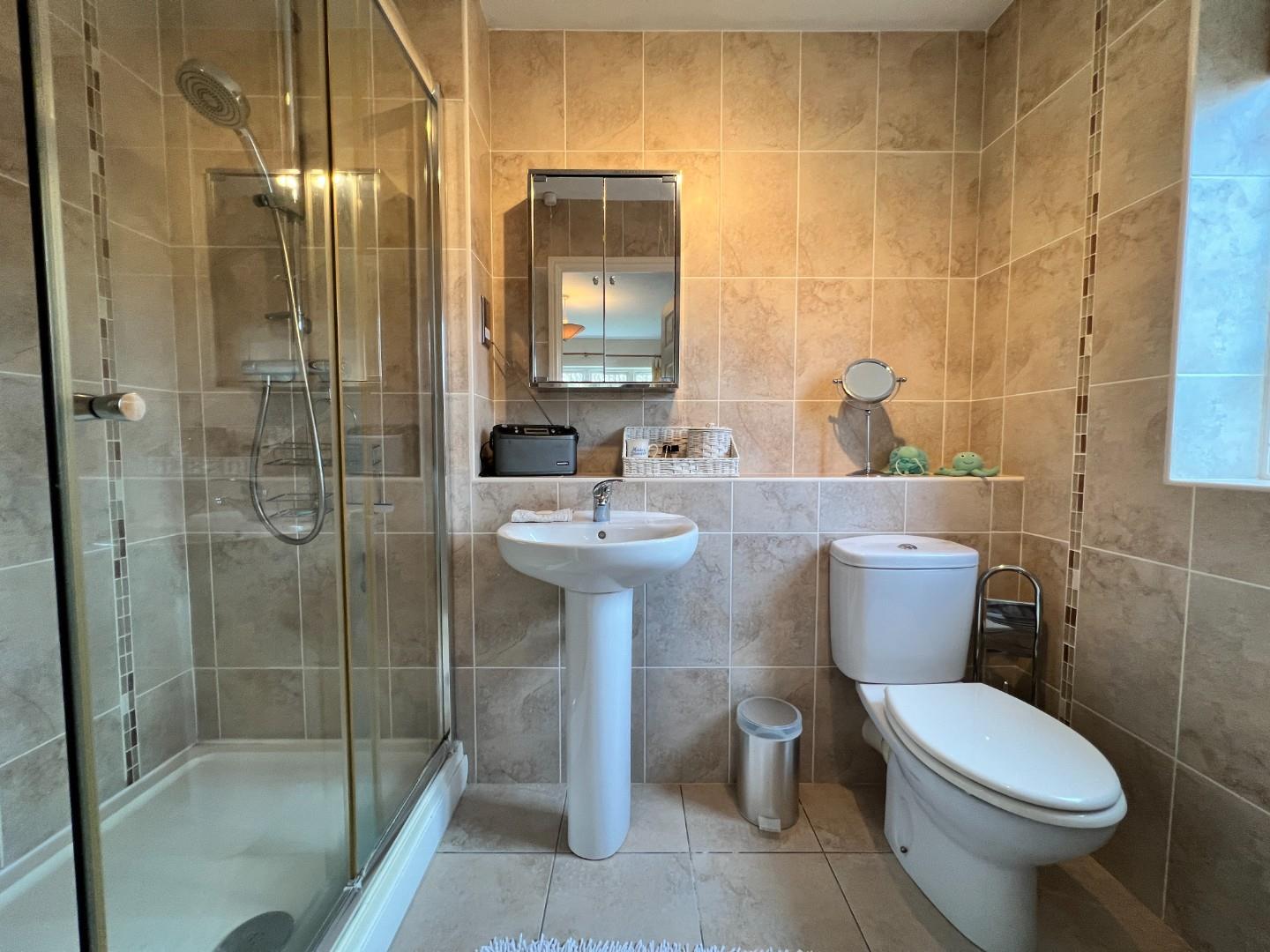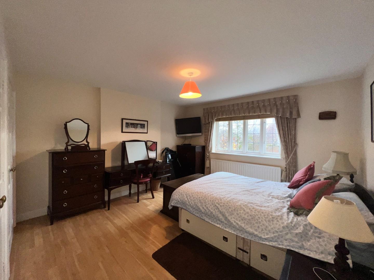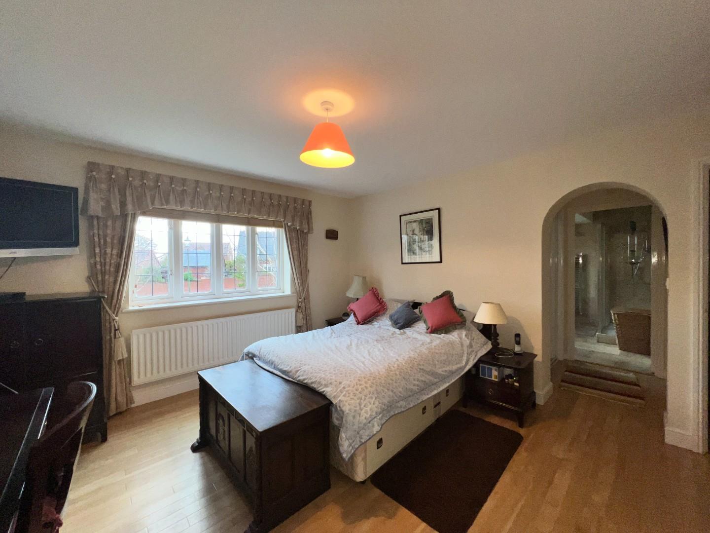 Upstairs, the master bedroom impresses with its generous proportions, a dedicated dressing area, and en-suite facilities. A second bedroom also benefits from an en-suite, while the remaining three bedrooms share a beautifully appointed family bathroom, featuring a freestanding tub and travertine-tiled walls for a touch of luxury.