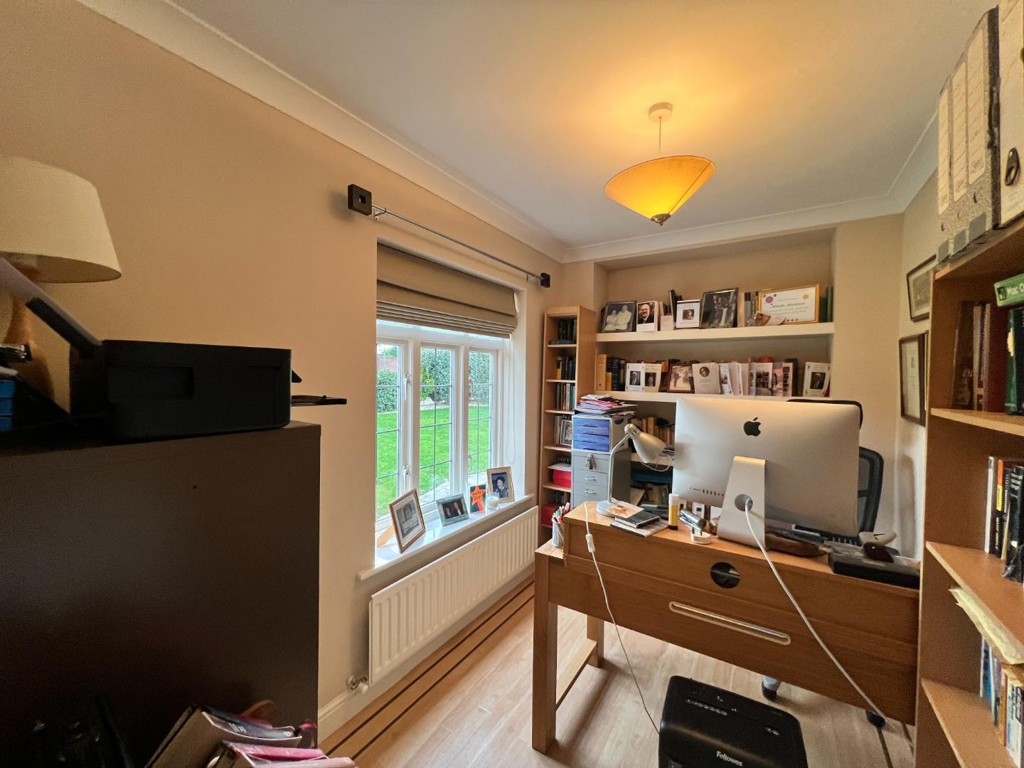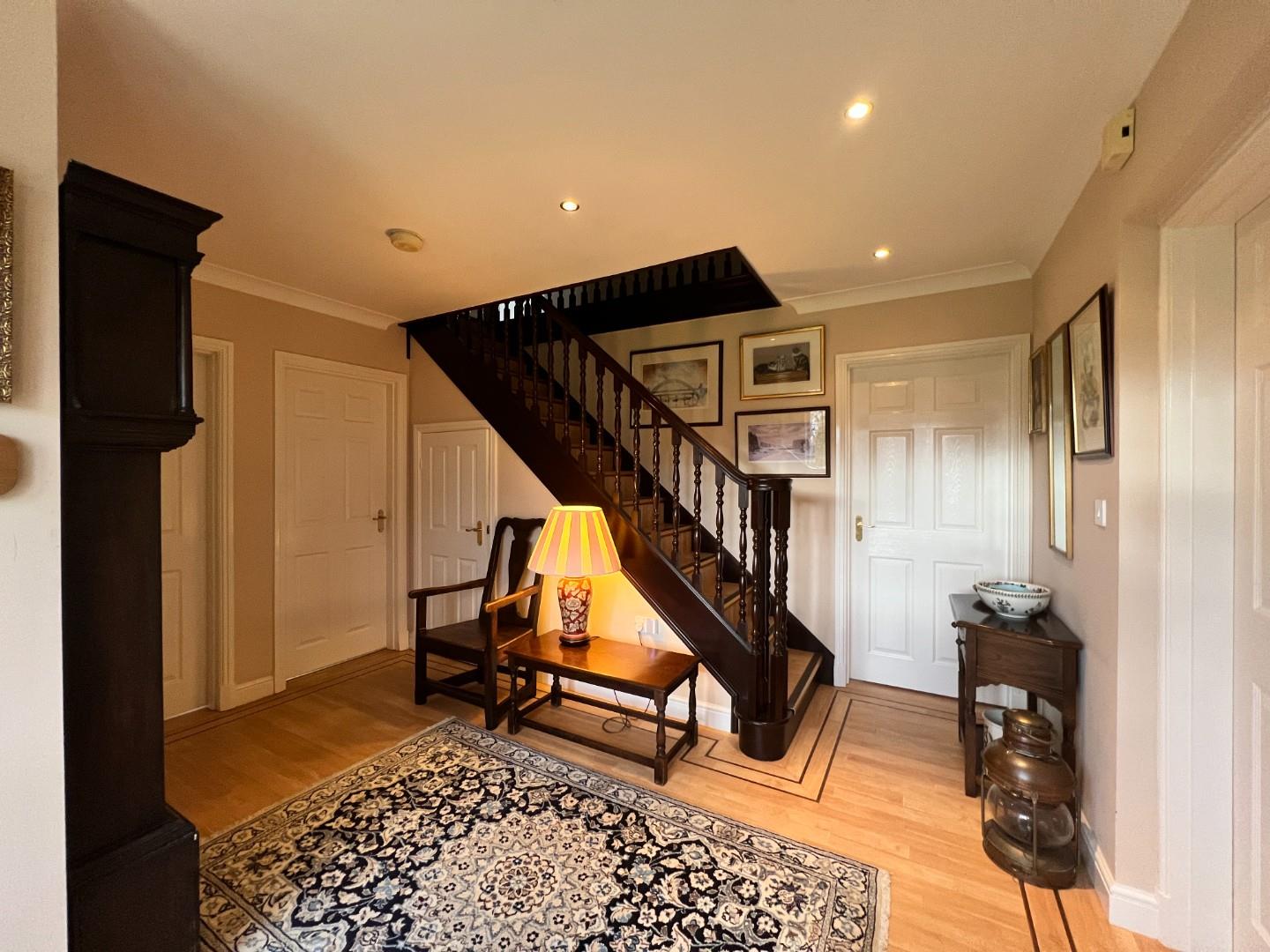 Upon entering, you are greeted by a wide and inviting hallway, beautifully finished with Kardean flooring, setting the tone for the rest of the home. The dual-aspect lounge is a standout feature, boasting a large bay window, French doors leading to the rear garden, and an impressive brick inglenook fireplace as its centrepiece. Two additional reception rooms provide versatile spaces, currently utilised as a study and a formal dining room. The breakfasting kitchen, complete with a range of built-in appliances, is both stylish and functional, complemented by a utility room and a convenient cloakroom/WC on the ground floor.
