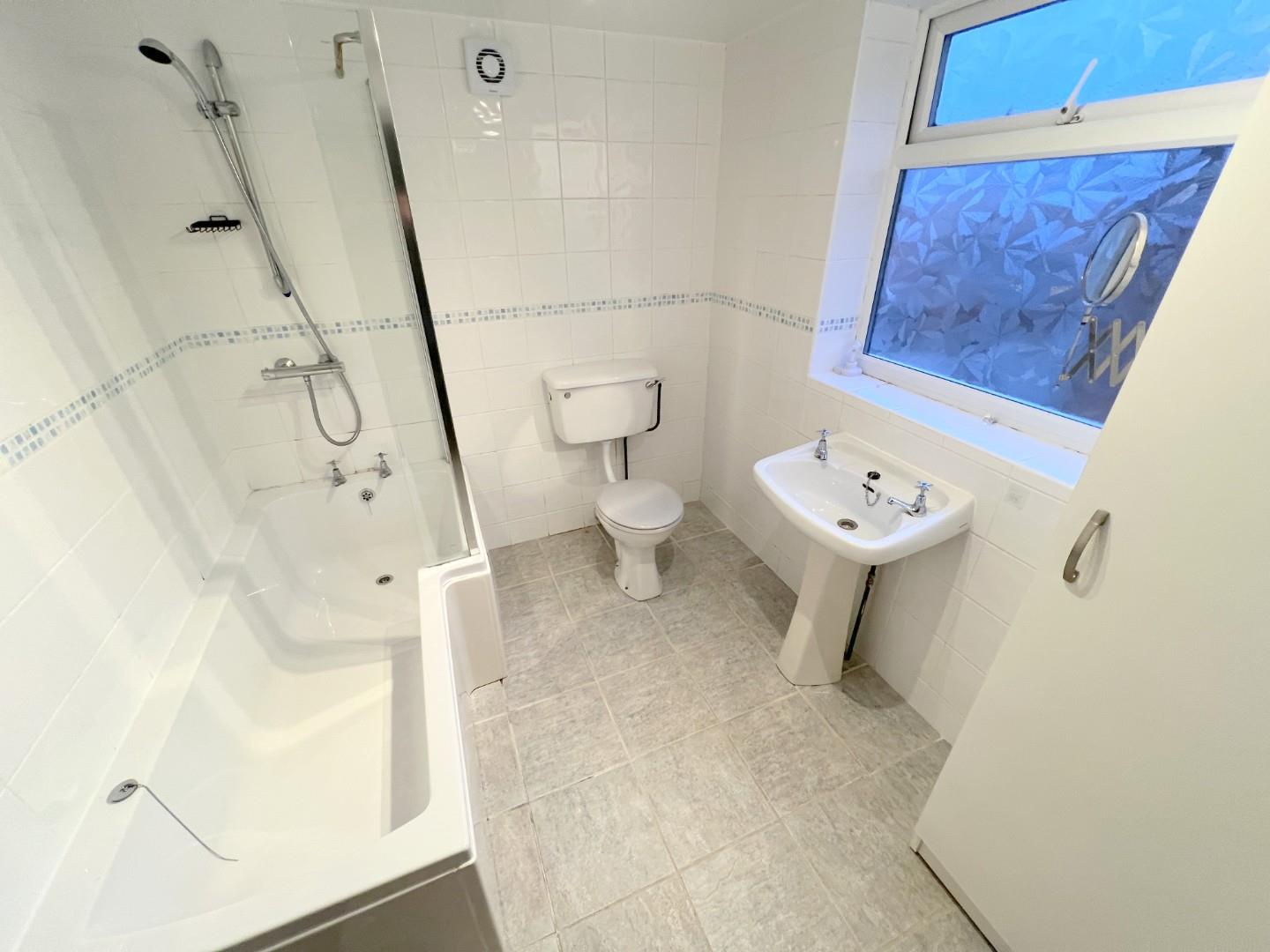 Upstairs, the property offers two well-proportioned bedrooms. The master bedroom benefits from fitted wardrobes, while the second bedroom provides ample space and additional storage. The bathroom comprises a white suite with a shower over the bath, tiled walls, and a wall-mounted combination boiler.