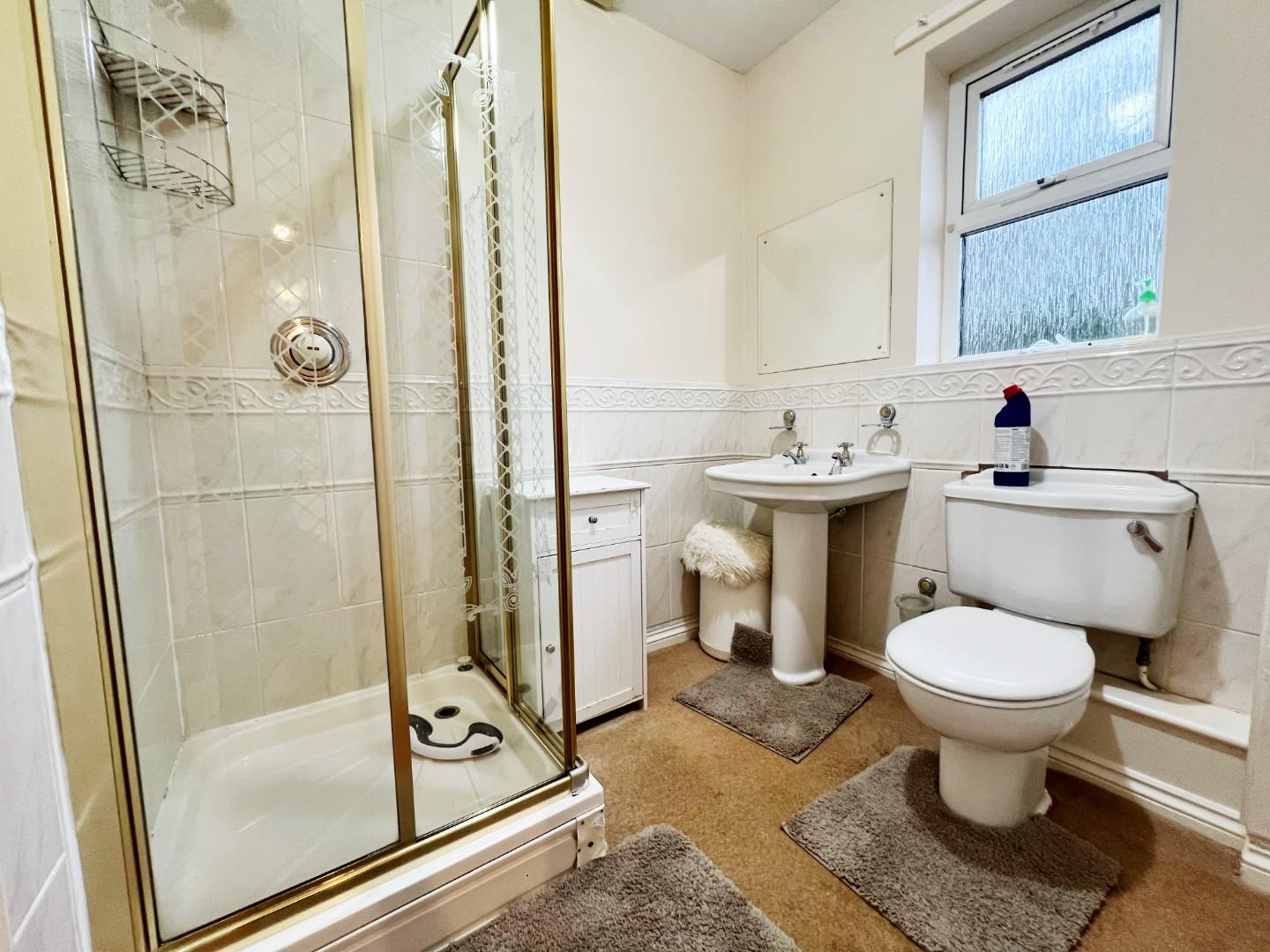 Shower cubicle, wash hand basin, w/c, tiled splash backs, radiator, UPVC window