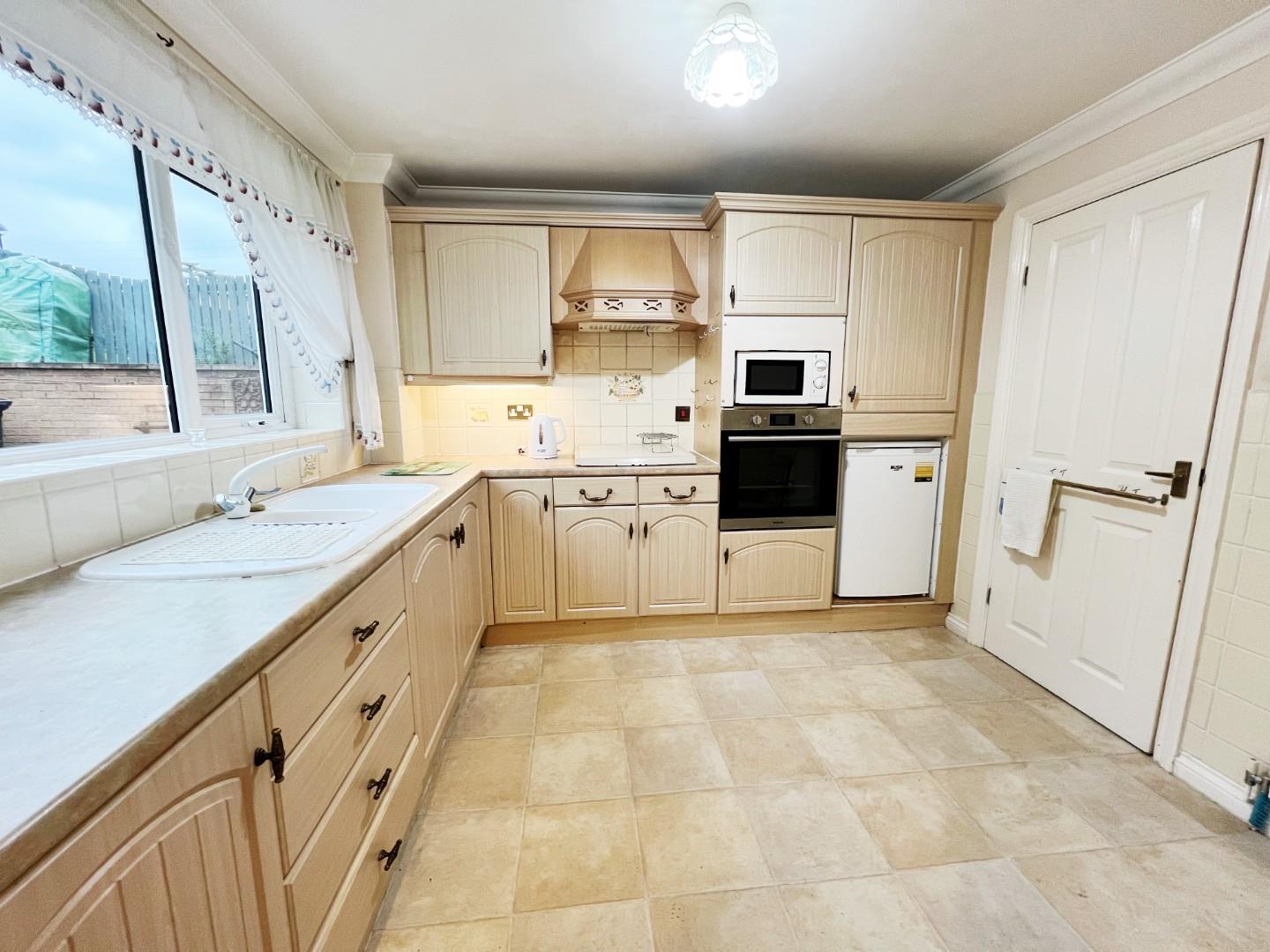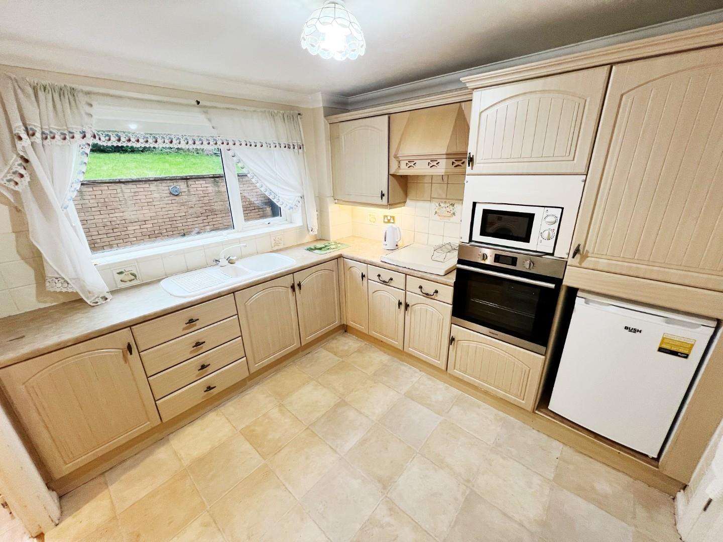 Wall and base units, integrated oven, hob, extractor fan, fridge and freezer, sink with mixer taps and drainer, radiator, UPVC window, tiled splash backs