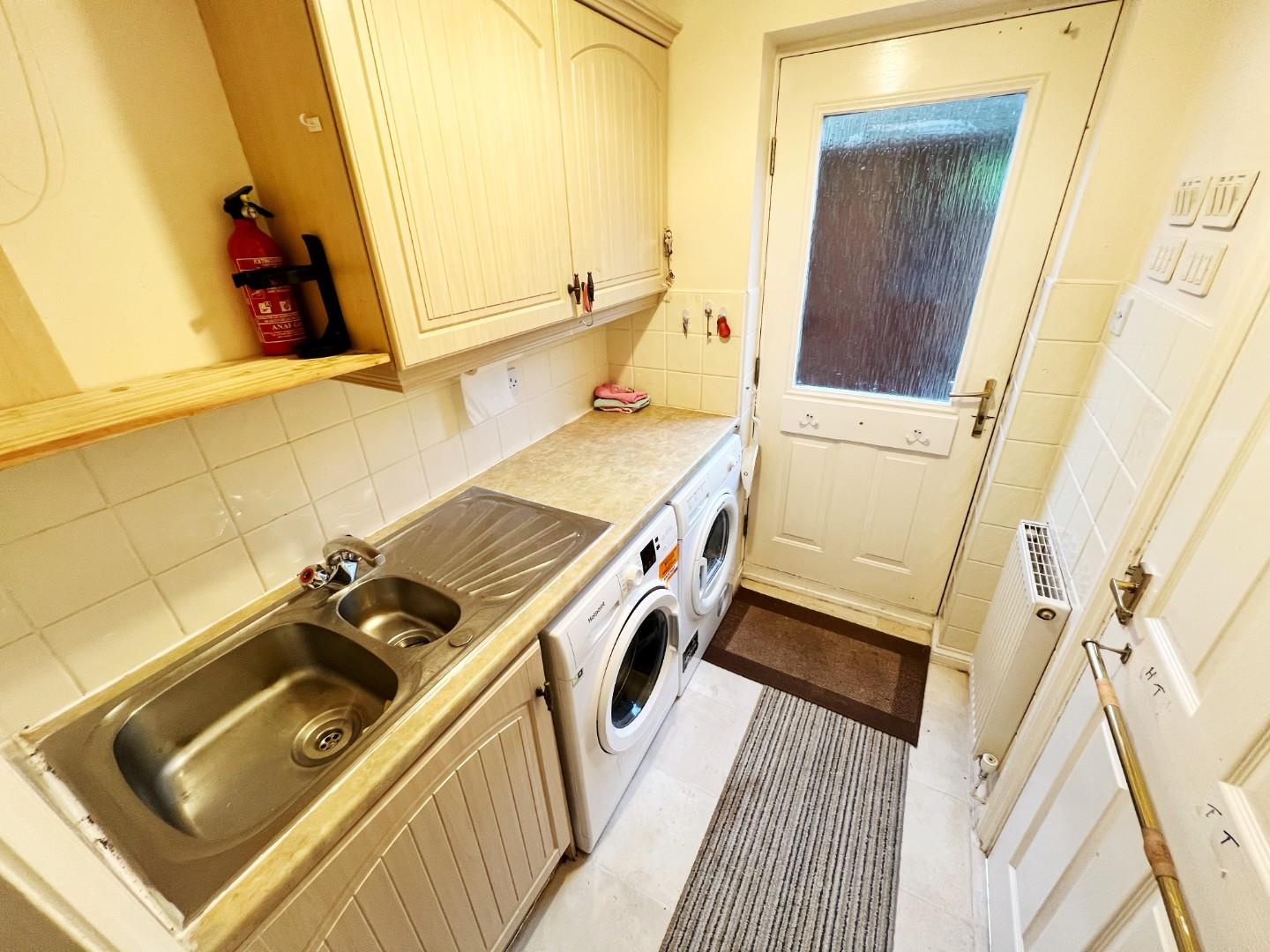Wall and base units, plumbed for washing machine ( washer is included), there is also a tumble dryer, stainless steel sink with mixer tap and drainer, radiator, access to rear, extractor fan.