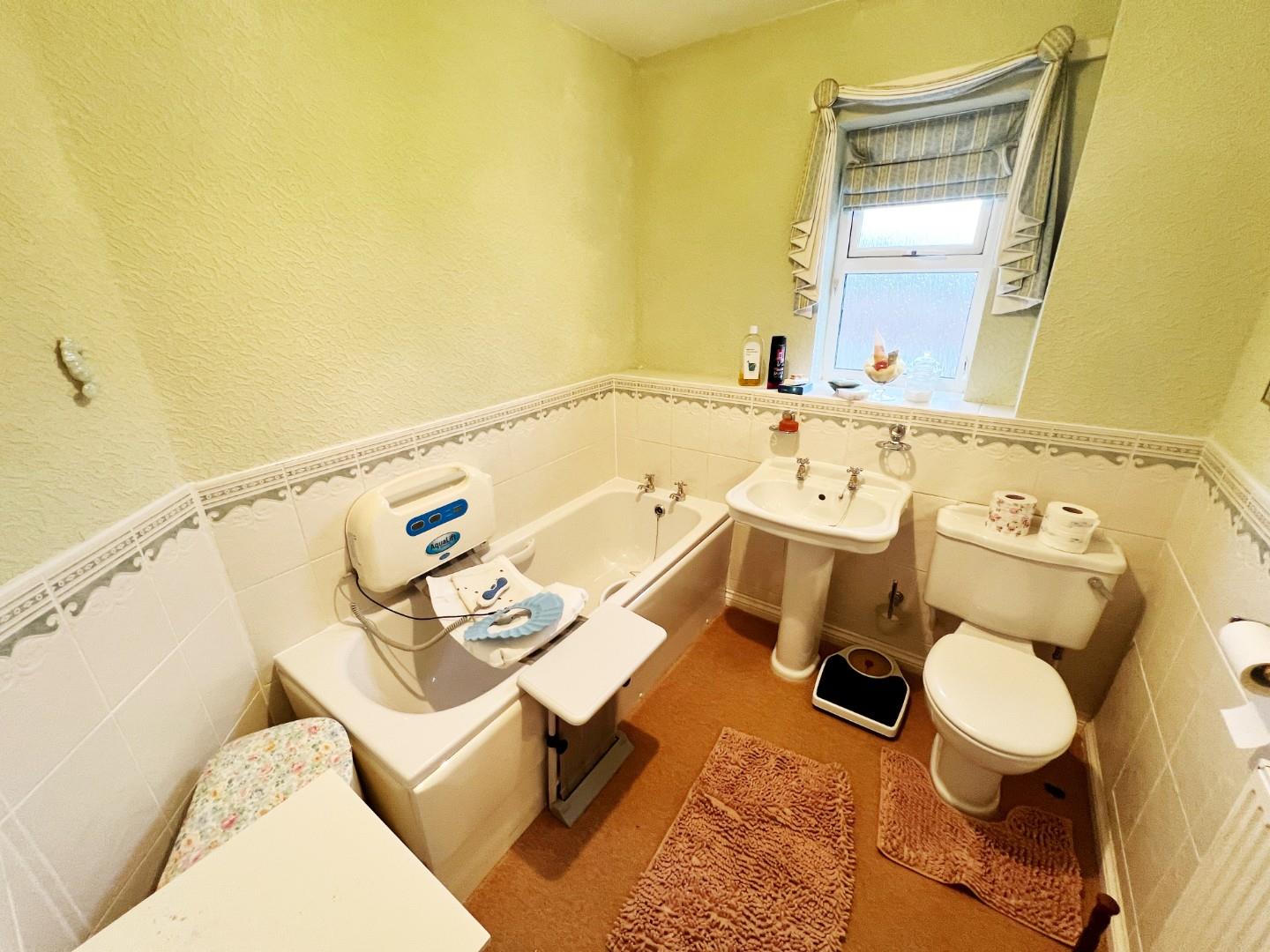 White panelled bath, w/c, wash hand basin, tiled splash backs, UPVC window, radiator.