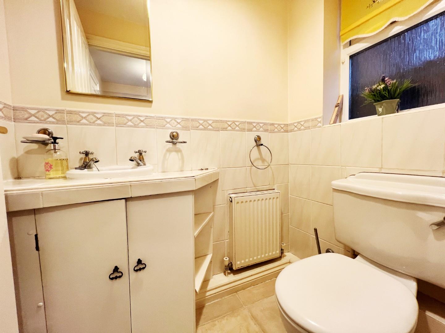 w/c, radiator, wash hand basin, radiator, tiled splash backs, UPVC window