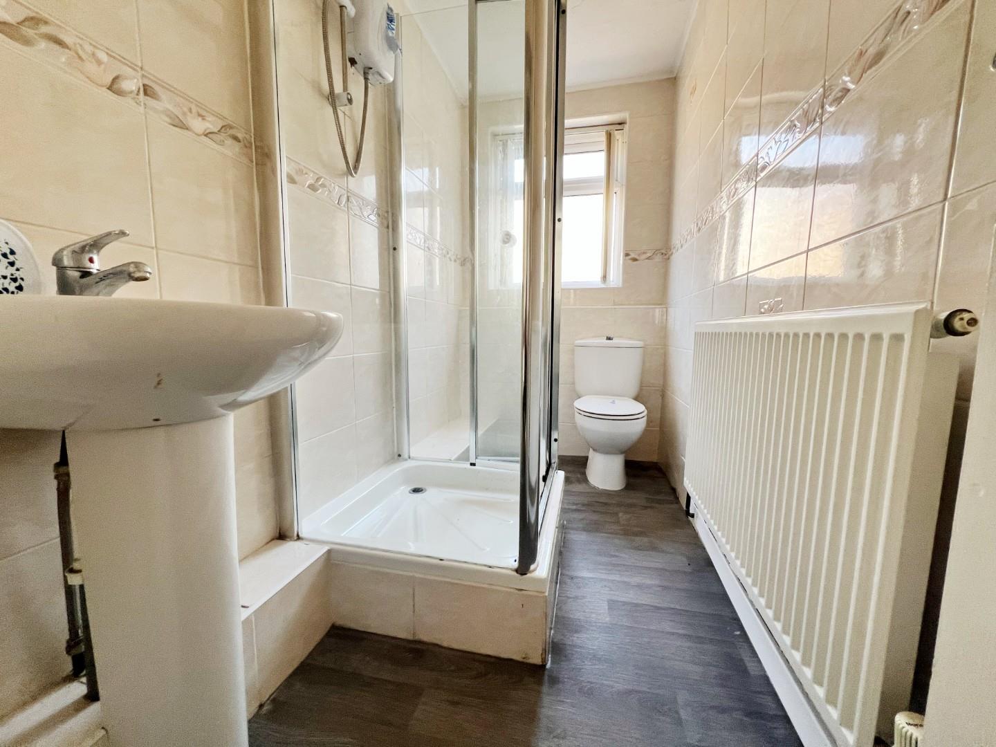 Shower cubicle, wash hand basin, W/C, uPVC window, radiator, tiled splashbacks.