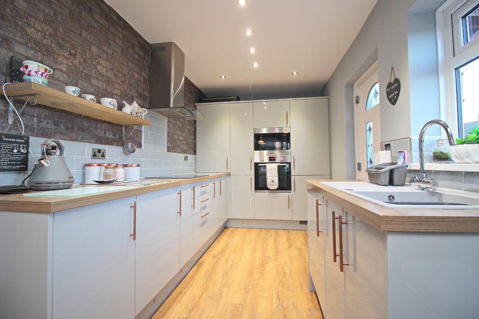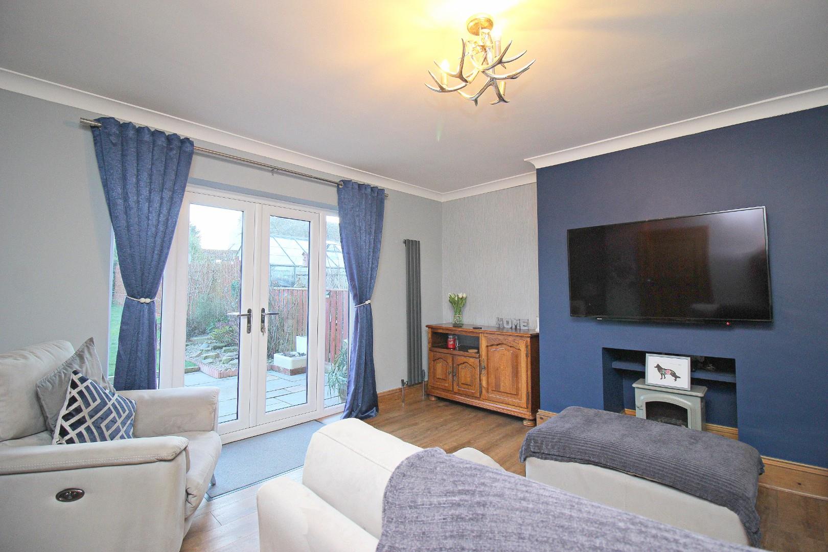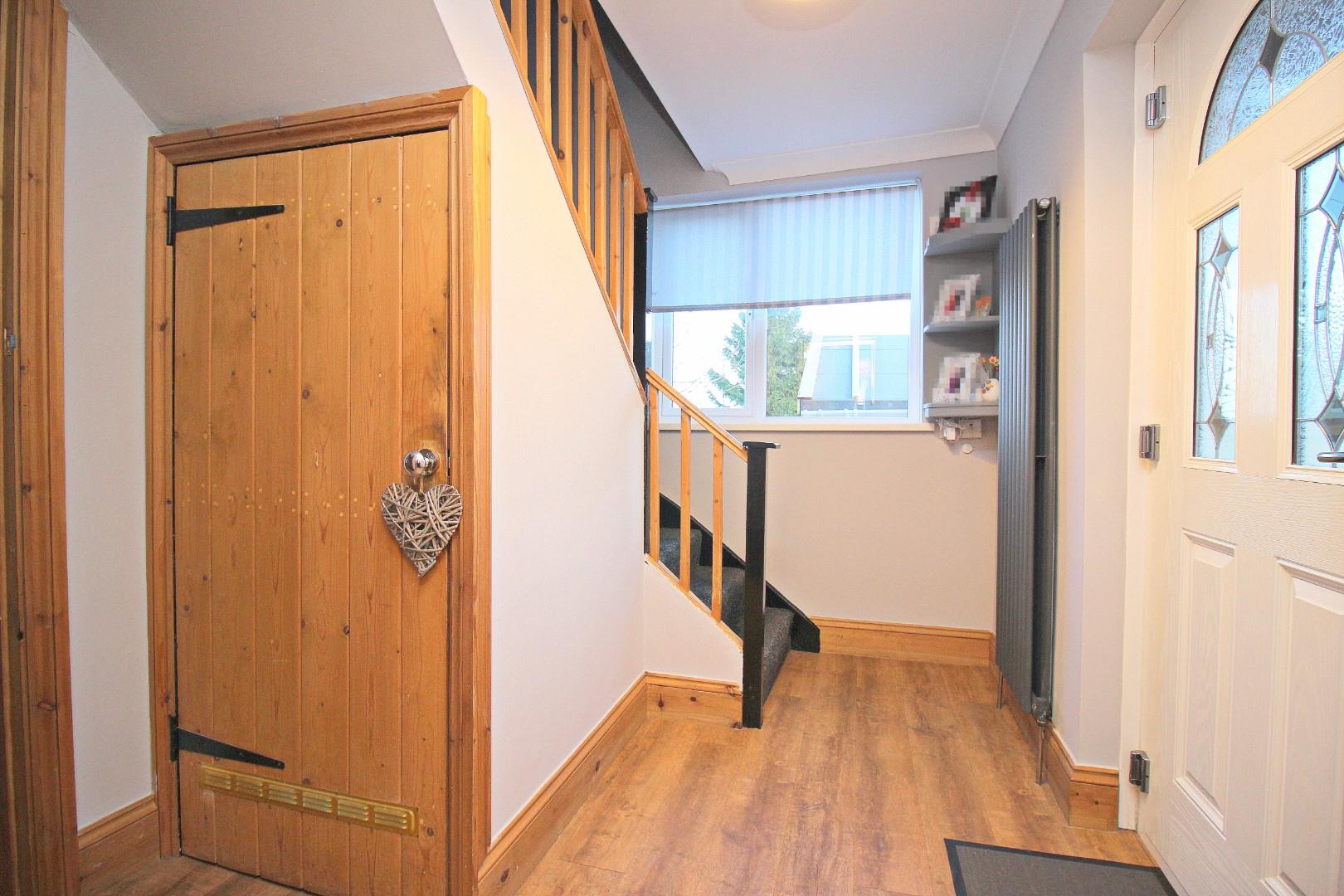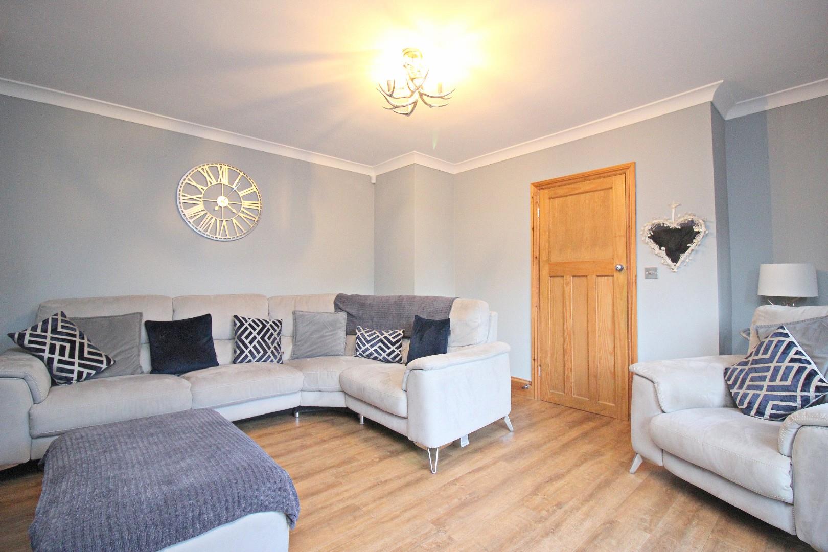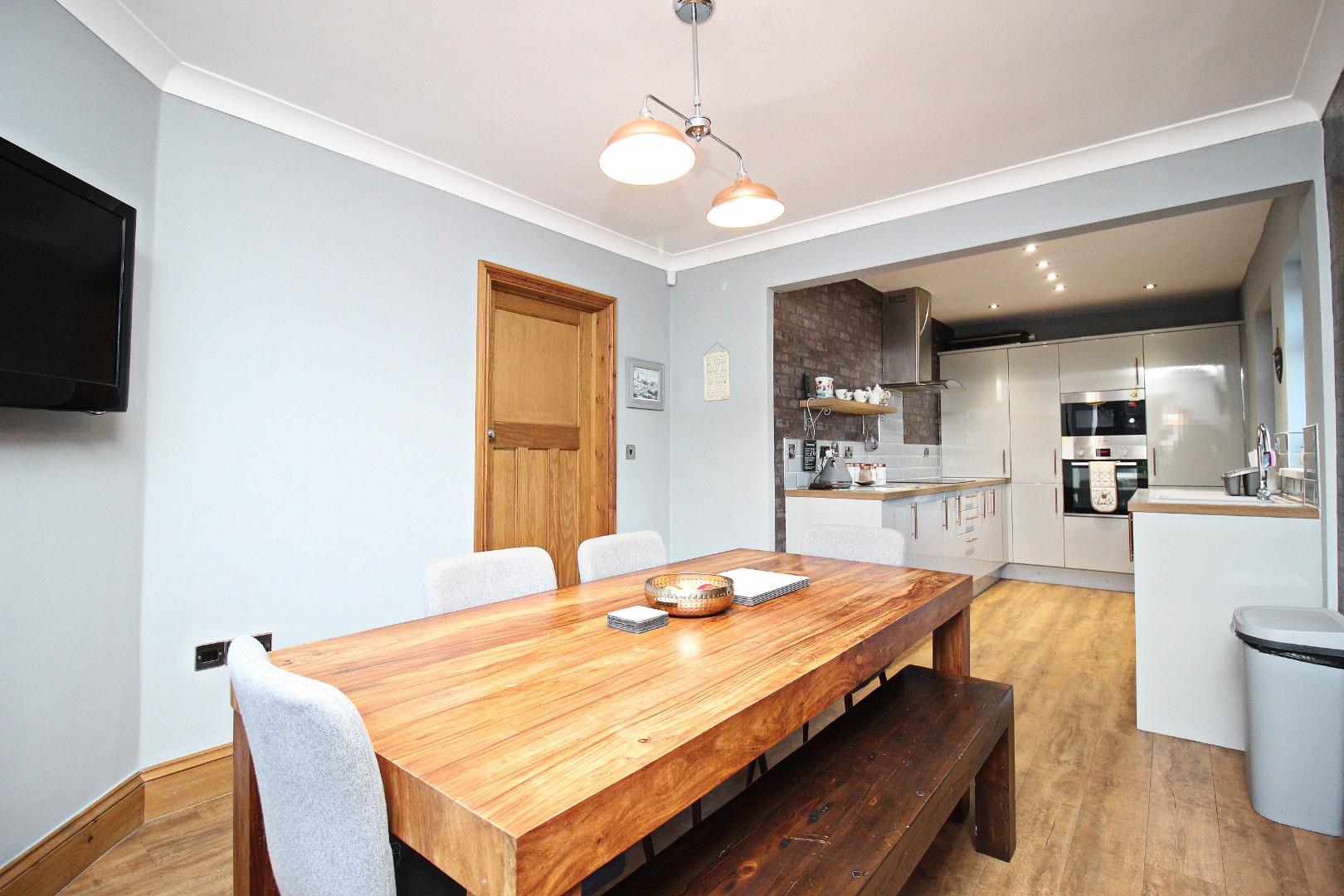 Inside, the layout includes a welcoming entrance hallway with storage, a bright and airy lounge with French doors that open onto the impressive garden, and a stunning contemporary dining kitchen featuring sleek wall and base units, offering plenty of space for entertaining.