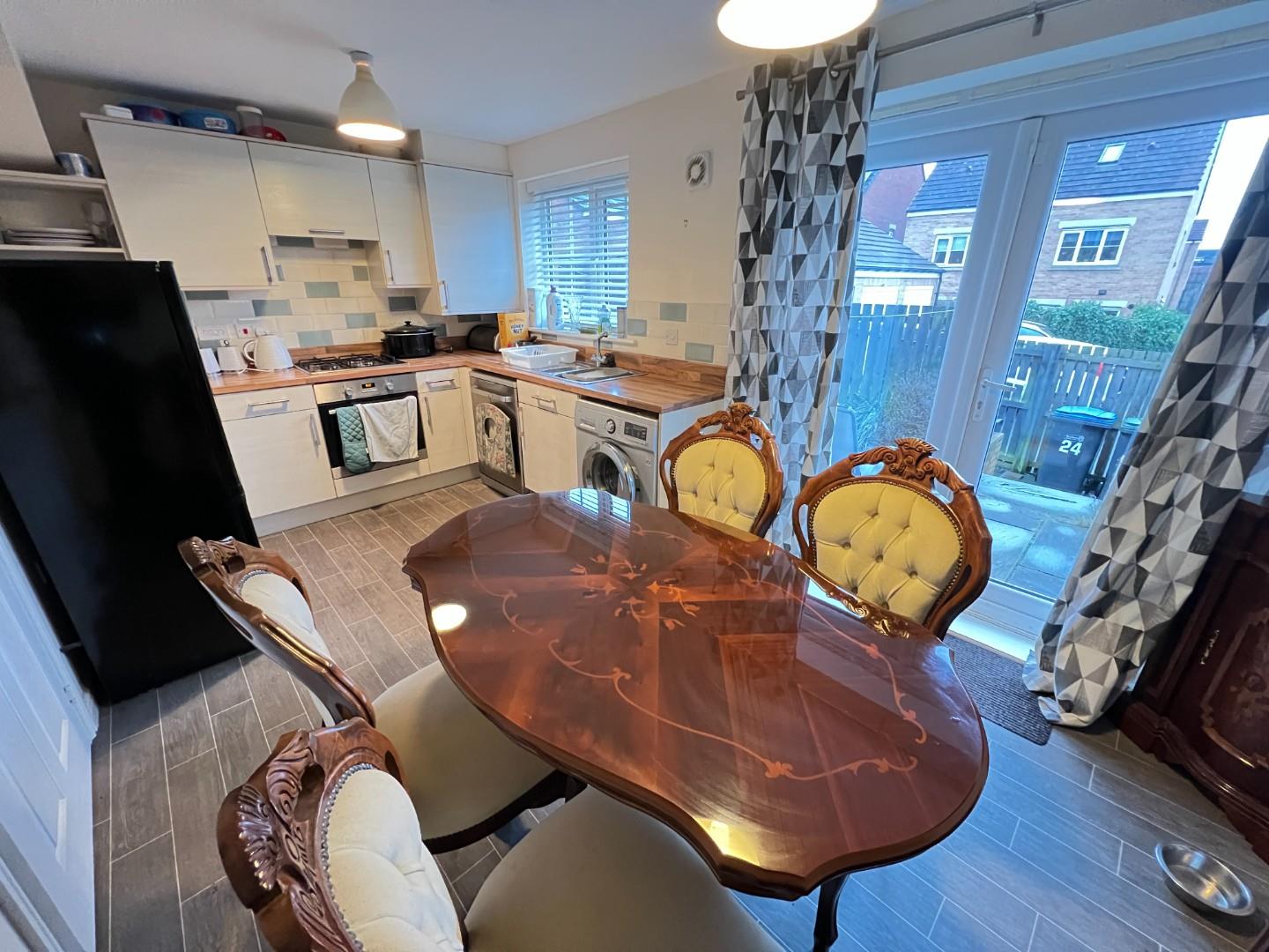 Upon entering, you are welcomed by a bright entrance hallway that leads to a convenient downstairs WC/cloakroom. The generous lounge provides a comfortable space for relaxation, while the open-plan kitchen/diner is a true highlight. It features a modern range of white matte fitted wall and base units, integrated appliances, and UPVC French doors that open out to the rear garden, creating a seamless indoor-outdoor living experience.
