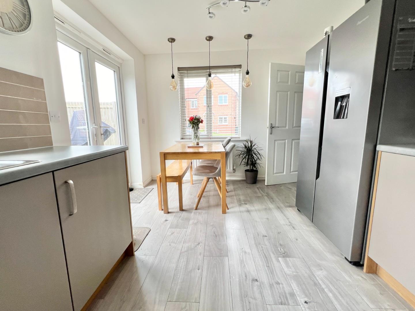 The internal accommodation comprises; entrance hallway, cloakroom/WC, lounge with windows to front and side aspect. Kitchen/dining room, fitted with a range of wall, base and drawer units with space for appliances and dining table, French doors leading to the rear garden.