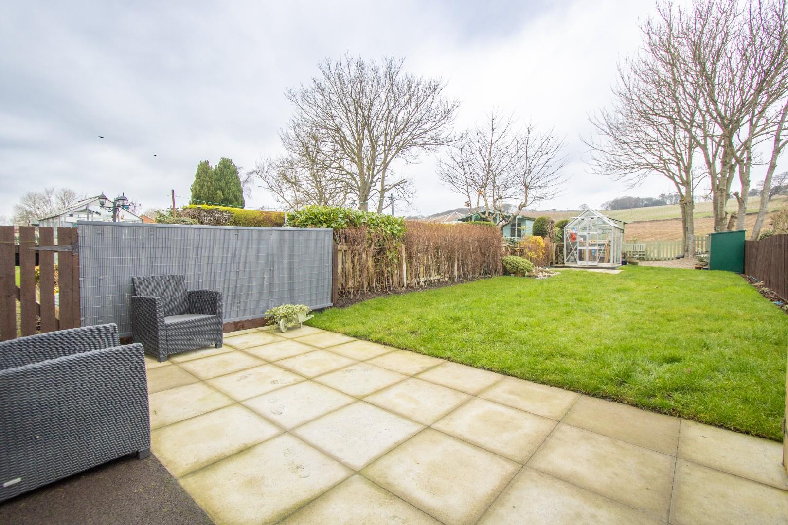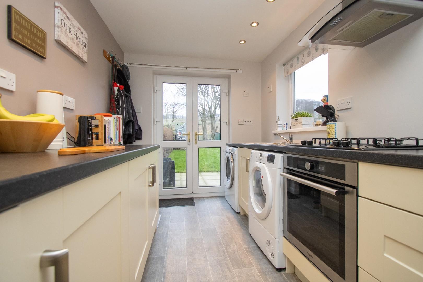 The accommodation briefly comprises: a welcoming entrance hallway leading to a comfortable lounge, and a modern open-plan kitchen and dining area. The dining space comfortably accommodates a table and chairs, ideal for everyday living and entertaining, while the kitchen is fitted with a contemporary range of units and enjoys French doors opening directly onto the rear garden, perfectly framing the outlook.