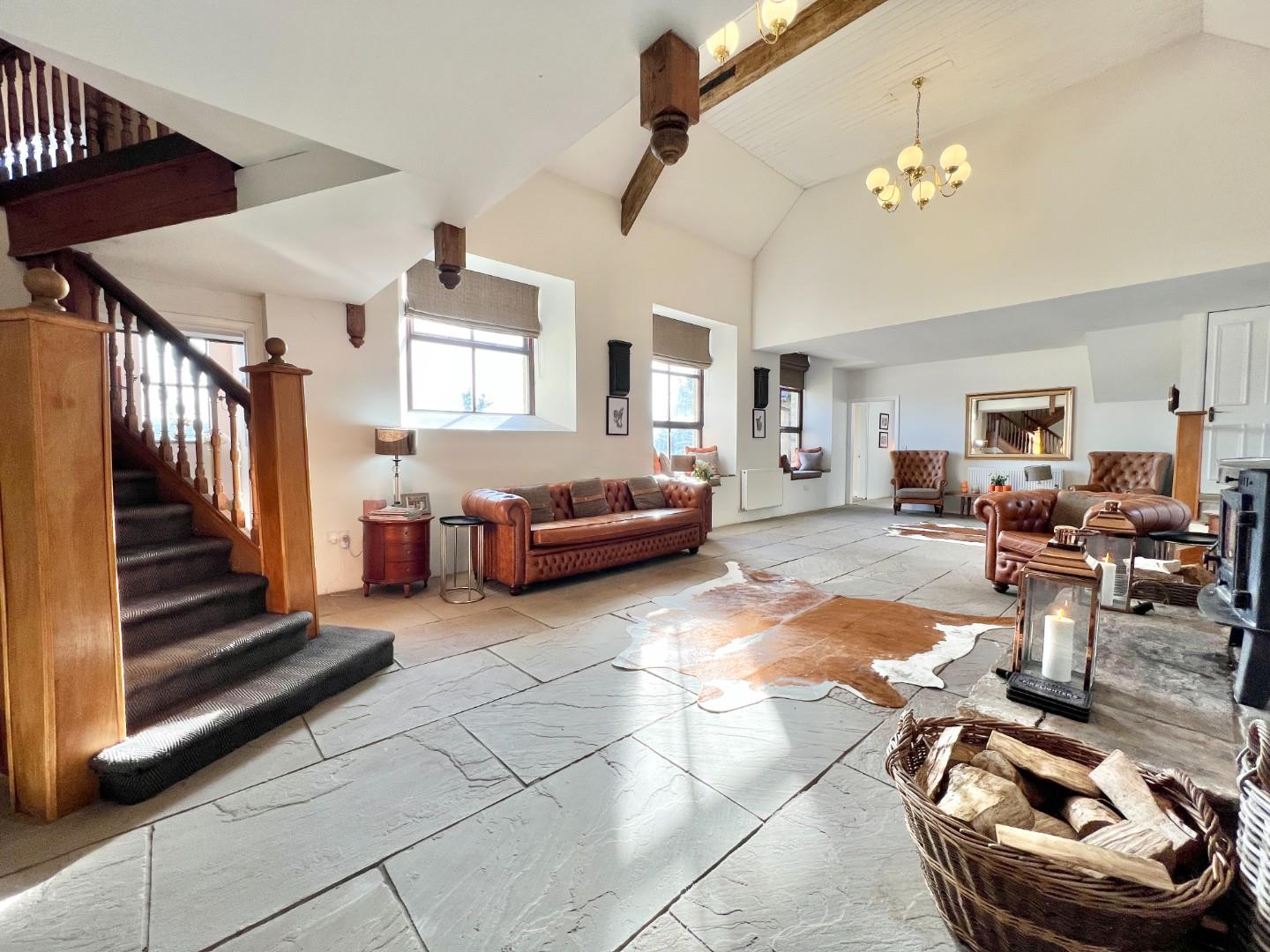 Upon entering the property, you will be greeted by an abundance of elegant and spacious living spaces spread across three floors. The ground floor boasts an entrance hall, a grand open-plan lounge with a mezzanine balcony, creating a striking focal point. Additionally, you will find a separate drawing room, an office for those seeking a private workspace, a beautifully appointed kitchen featuring an Aga stove, a dining room, cloakroom, a utility room, a practical boot room, and a bar area, perfect for entertaining guests.