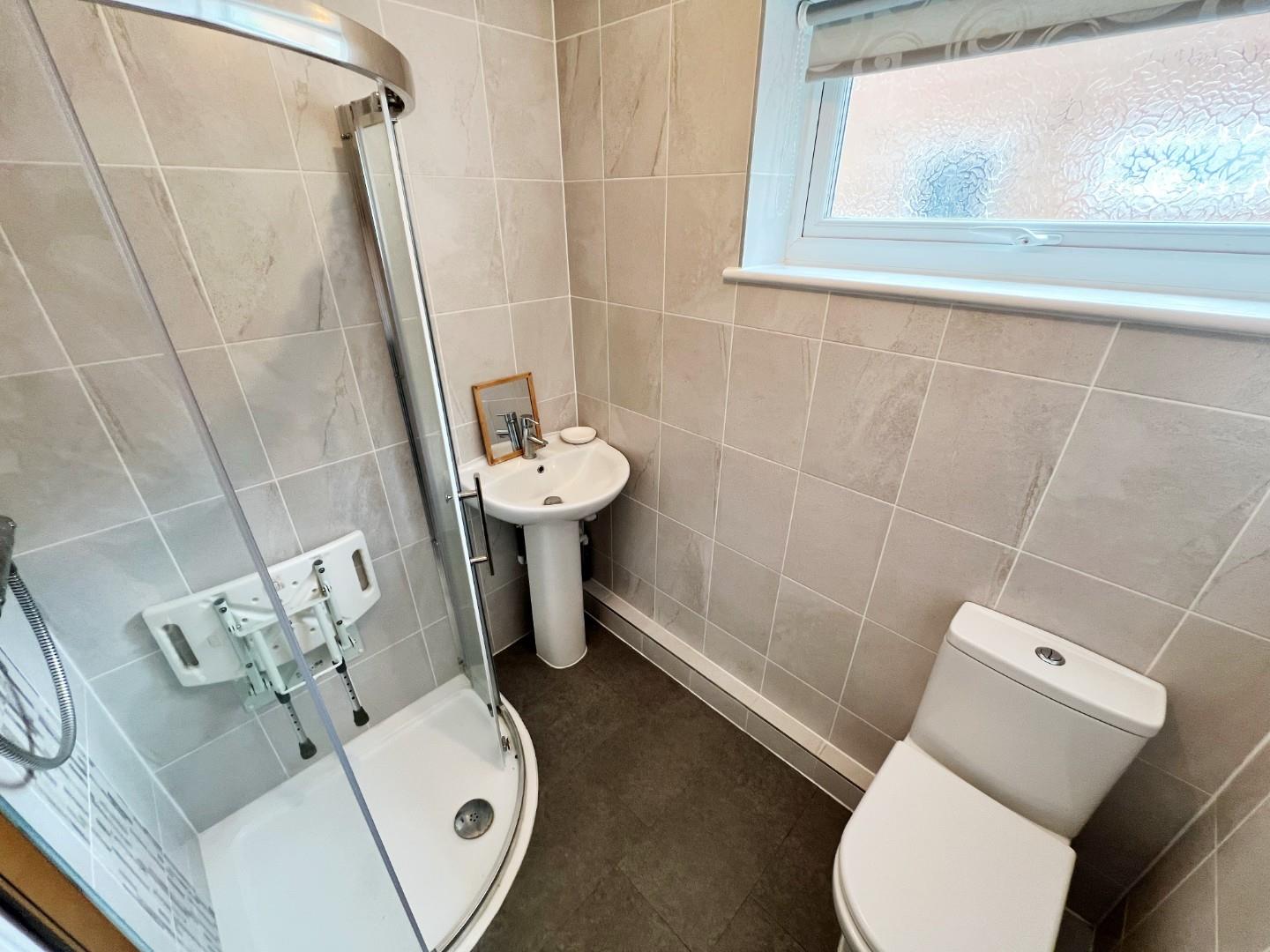 Shower cubicle, wash hand basin, W/C, tiled splashbacks, uPVC window.
