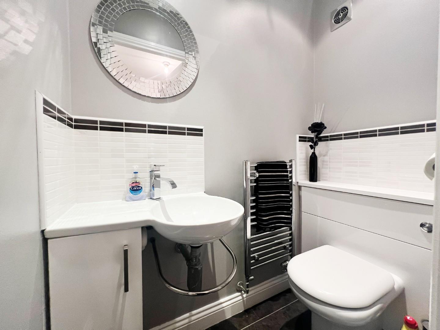 WC, wash hand basin, extractor fan, spotlights and central heating radiator.