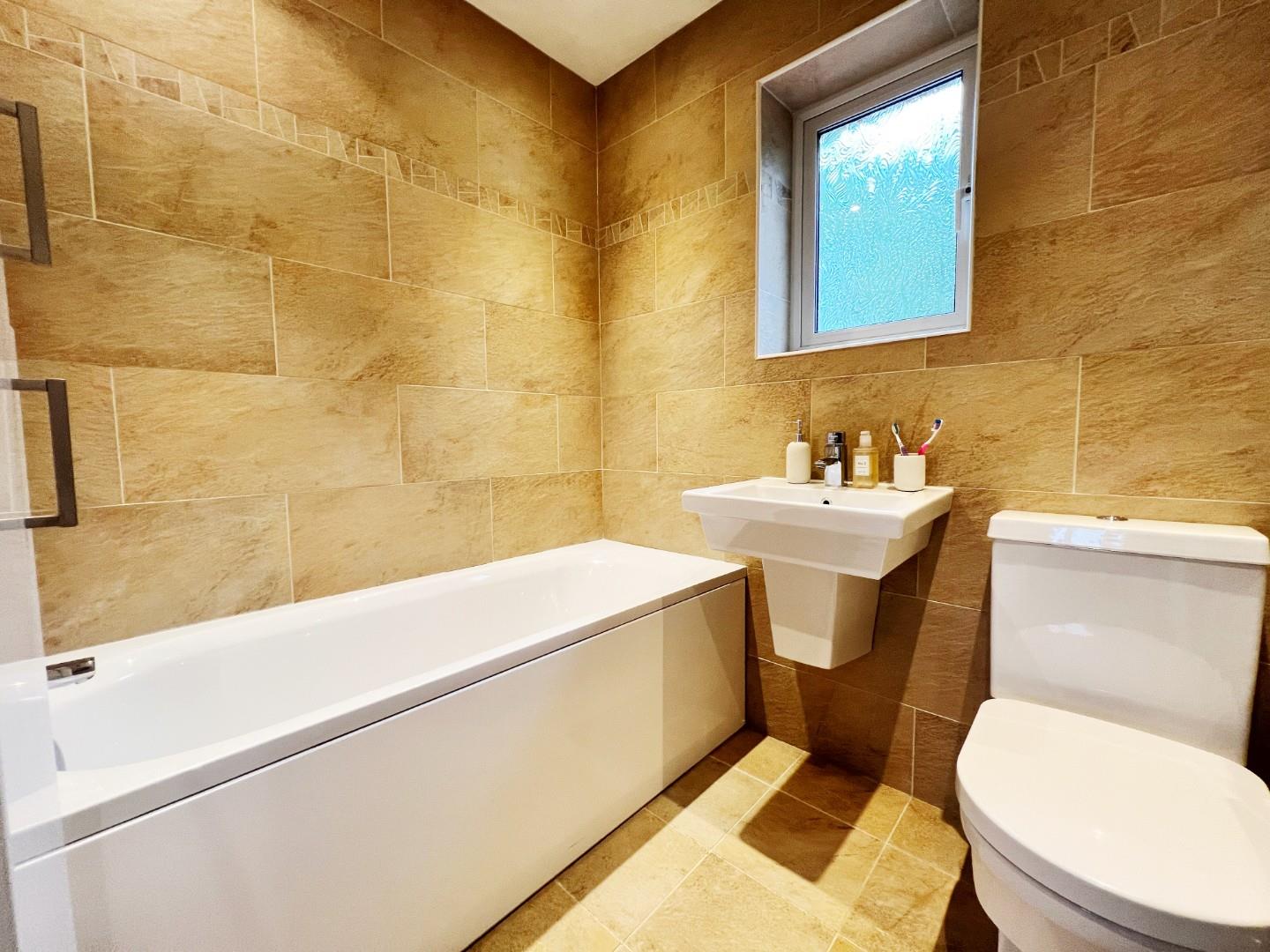 White panelled bath, wash hand basin, fully tiled, WC, spotlights, extractor fan, central heating radiator and Upvc double glazed window.